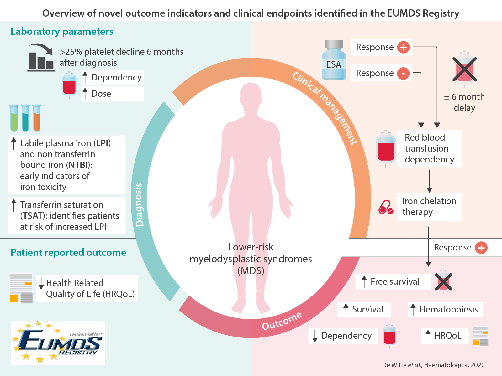 Figure 4.Overview of novel outcome indicators and clinical endpoints identified in the European LeukemiaNet myelodysplastic syndromes (EUMDS) Registry. ESA: erythropoietin stimulating agents; LPI: labile plasma iron; NTBI: non-transferrin bound iron; TSAT: transferrin saturation; HRQoL: health related quality of life.