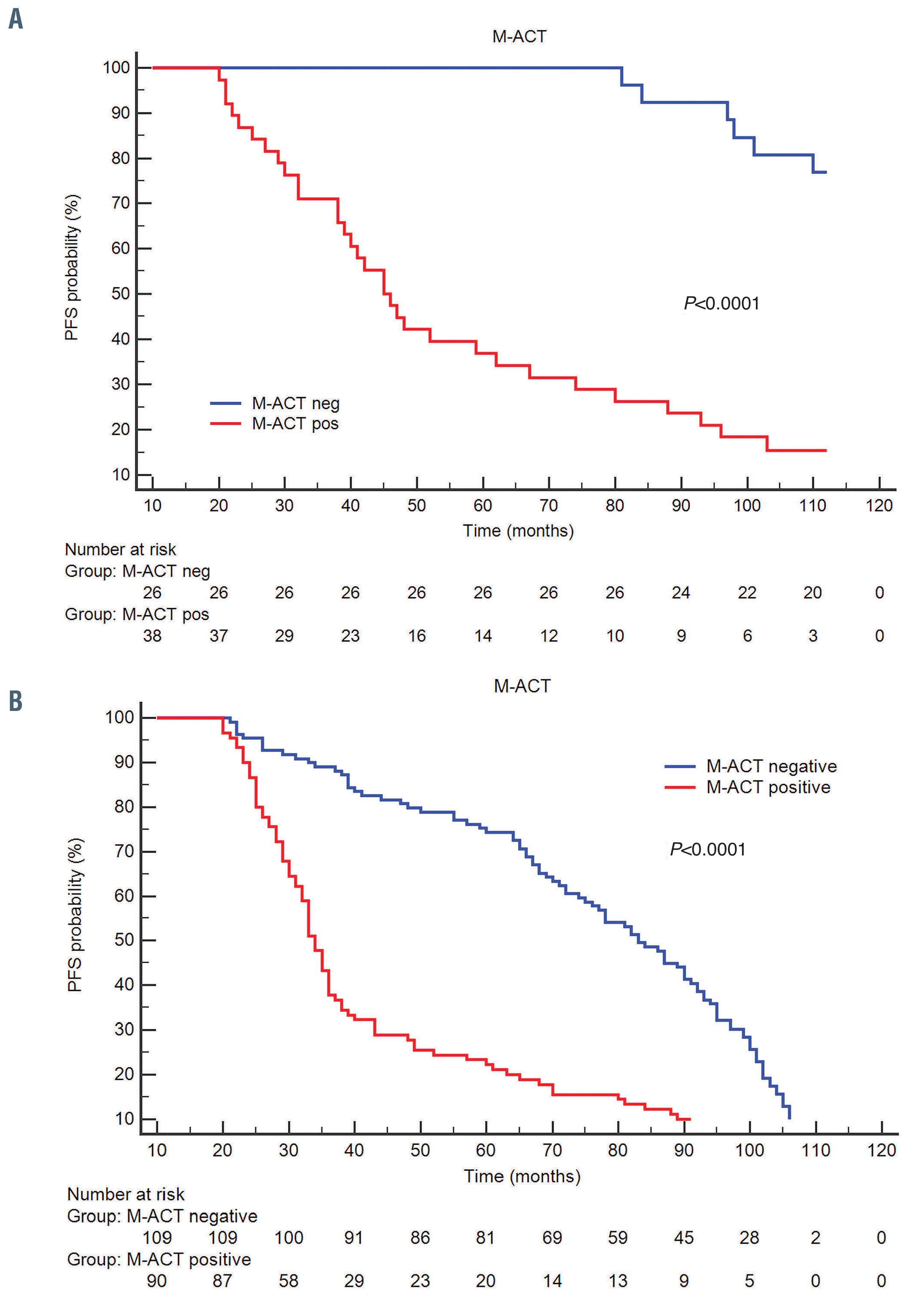 Figure 2.Kaplan-Meier curves for progression-free survival of polycythemia vera and of early/prefibrotic primary myelofibrosis patients. (A) Kaplan-Meier curve for progression-free survival (PFS) of polycythemia vera (PV) patients stratified by megakaryocytic activation (M-ACT); (B) Kaplan-Meier curve for PFS of early/prefibrotic primary myelofibrosis (PMF) patients by M-ACT. M-ACT positive patients (red-line) was significantly associated to a worse PFS (P<0.0001) with respect to those without M-ACT (blue-line) in both groups.
