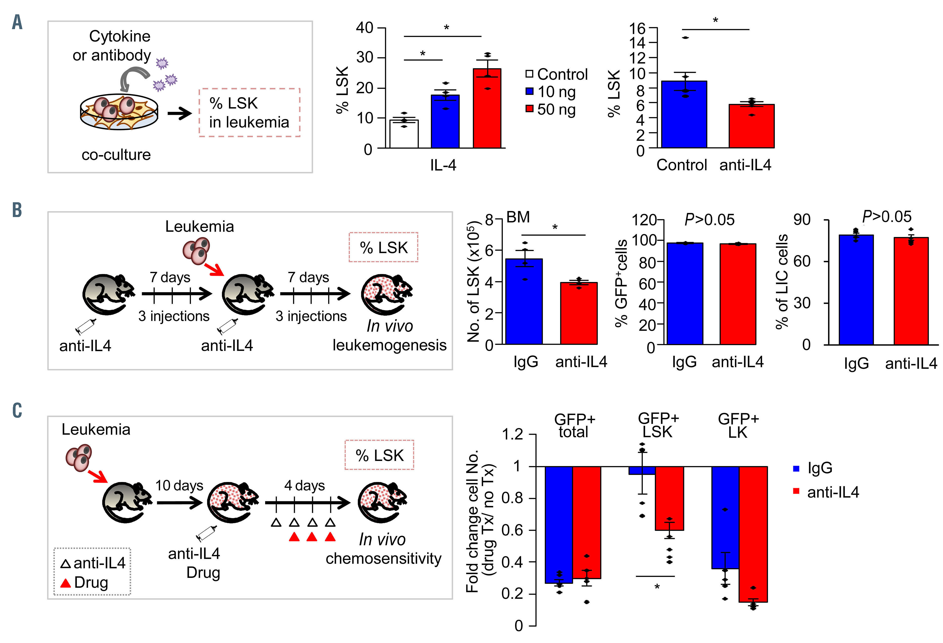 Figure 4.Role of stroma-induced interleukin-4 in the generation of the stem cell-like leukemic subset. (A) Effects of interleukin-4 (IL-4) during co-culture of leukemic cells. Left: experimental scheme; middle: % LSK generated during 3-day co-culture of leukemic cells with stroma supplemented with recombinant IL-4 (mean ± standard error of the mean [SEM], n= 6); Right: effects of antibody against IL-4 on generation of LSK during stromal co-culture of leukemic cells. Shown are the mean±SEM for % LSK in leukemic cells (green fluorescent protein positive [GFP+] CD45+) (n=7, *P<0.05). (B) Effects of IL-4 antibody on in vivo generation of LSK. Left: experimental design. Antibody against IL-4 was intraperitoneally administered into recipient mice at each indicated time point before and after transplantation of MN1 leukemic cells. Middle: numbers of LSK leukemic (GFP+) cells in the BM (two femurs and two tibia) of recipient mice. Middle and right: % of MN1 leukemic cell engraftment determined by total leukemic cells (GFP+ cells) (middle) and cells with leukemia-initiating cell properties (LK and LSK) (right), respectively (mean ± SEM, n=6, *P<0.05). (C) Effects of IL-4 antibody on the chemosensitivity of the leukemic subsets. Left: experimental design. After engraftment of MN1 leukemic cells (10 days after transplantation), recipients were injected with IL-4 antibody and chemotherapeutic drug (AraC+doxorubicin) at the indicated times. Right: changes in the chemosensitivity of leukemic subsets by in vivo injected IL-4 antibody. Relative fold decrease in the cell numbers of each leukemic subset compared to the control (phosphate buffered saline) group 3 days after exposure to drug and antibody (mean ± SEM, n=5).