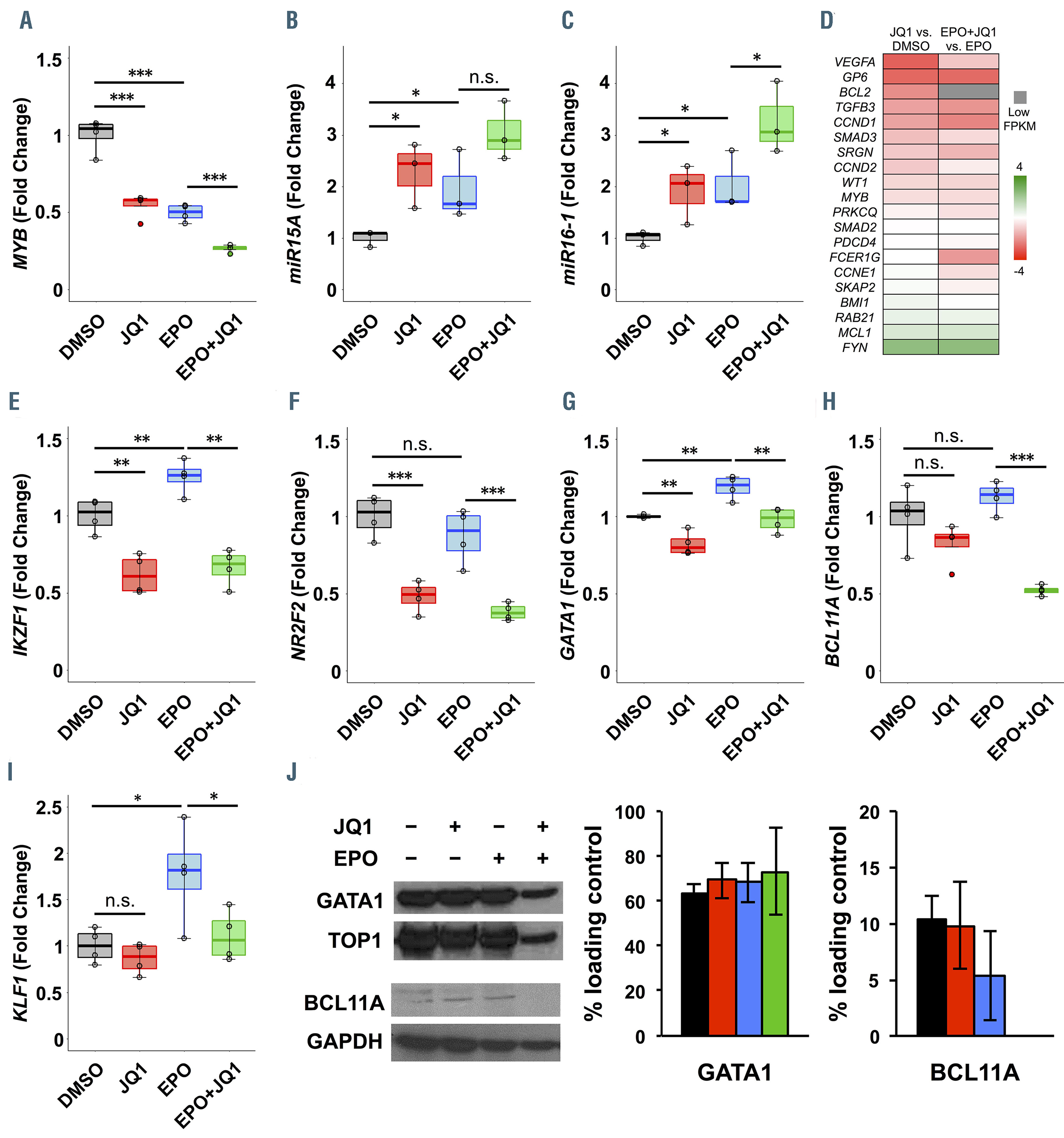 Figure 2.JQ1 downregulates known inhibitors of fetal hemoglobin. (A to C) qPCR quantification of (A) MYB, (B) miR-15A, (C) miR-16-1, in TF-1 cells after treatment with JQ1 (red), erythropoietin (EPO) (blue), EPO+JQ1 (green) vs. dimethyl sulfoxide (DMSO) (control, black) for 3 days. (D) Heatmap representing RNA sequencing quantification of expression changes (log2 fold-changes in FPKM) of known miR-15A and miR-16-1 targets in JQ1 treated TF-1 cells vs. control, with or without EPO. Log2 fold-change ranges from -4 (red, suppressed by JQ1) to 4 (green, induced by JQ1). Genes with low expression (FPKM<1) were excluded or represented with gray box. (E to I) qPCR quantification of (E) IKZF1 (encodes IKAROS), (F) NR2F2 (encodes COUP-TF2), (G) GATA1, (H) BCL11A, and (I) KLF1 in TF-1 cells after treatment with JQ1 (red), EPO (blue), EPO+JQ1 (green) vs. DMSO (control, black) for 3 days. (J) Western blots for GATA1 and BCL11A with corresponding loading controls. Quantifications of signal intensity, normalized to loading controls, are shown as bar graphs to the right of the western blots. N=3 for panels (B), (C), and (J). N=2 for panel (D). N=4 for all other panels. *P<0.05, **P<0.01, ***P<0.001, n.s.: not statistically significant (Student’s t-test).