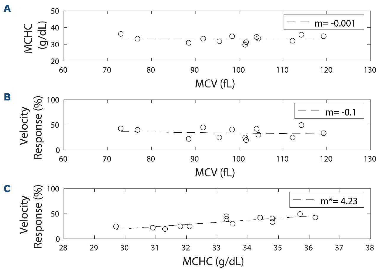 Figure 2.Dependent parameter analysis. Correlative data from 13 untreated sickle cell disease (SCD) samples to determine the relationship, if any, between mean corpuscular volume (MCV) and mean cell hemoglobin concentration (MCHC) and each variable’s relation to sample velocity response. A Pearson correlation coefficient analysis was used to determine the strength of the linear relationship and a two-tailed analysis of the Pearson coefficient was used to determine significance of the correlation. (A) No correlation was identified between MCV and MCHC (r=-0.008, P=0.982), establishing MCV and MCHC as independent variables. (B) MCV as it relates to velocity response. No correlation was identified between MCV values and velocity response (r=-0.13, P=0.660). A slope of -0.001 and -0.1 are found in (A) and (B) respectively. The slope for these figures is provided for clarification of the scale for (A and B). (C) MCHC and velocity response had a significant correlation (r= 0.83, P<0.001).
