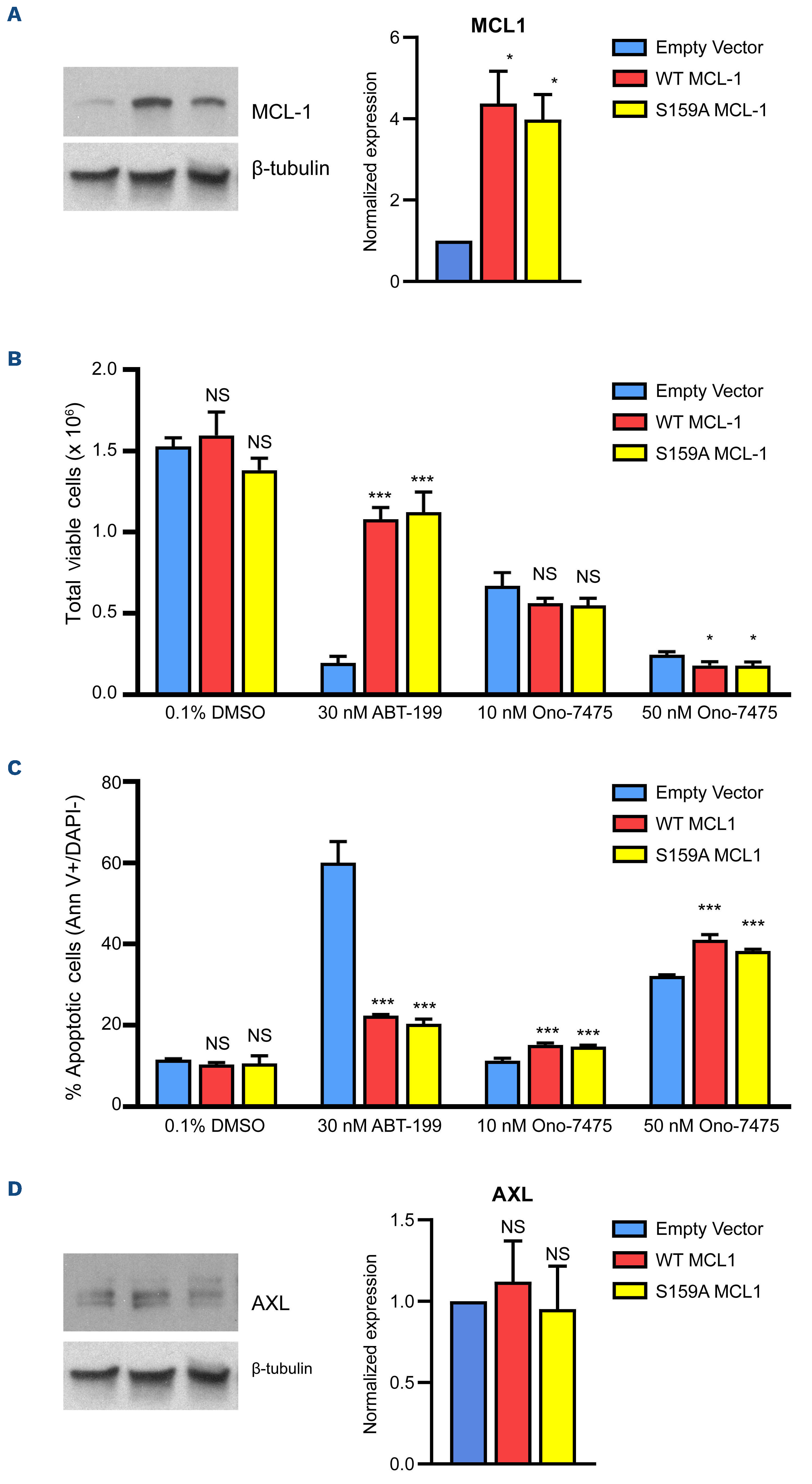 Figure 4.MV4;11 cells overexpressing WT or gain of function S159A mutant MCL-1 are resistant to ABT-199 but are similarly sensitive to ONO-7475 compared to control cells. MV4;11 control (Empty Vector; EV) and MV4;11 cells overexpressing WT MCL-1 or S159A mutant MCL-1 were treated with vehicle (0.1% DMSO), 10 nM, or 50 nM ONO-7475 for 72 hours. One-way ANOVA with Dunnett’s posttest was performed to determine significance (*P<0.033; **P<0.002; ***P<0.001) In (A) western blot of MCL-1 expression levels in EV control, WT MCL-1 OE, and S159A mutant MCL-1 OE are depicted. Viable total cells (B) and percentage of apoptotic cells (C) were determined by flow cytometry using counting beads, Annexin V, and DAPI. (D) AXL expression in MV4;11 cells based on MCL-1 expression levels. Densitometry was performed by normalizing to tubulin using ImageJ.
