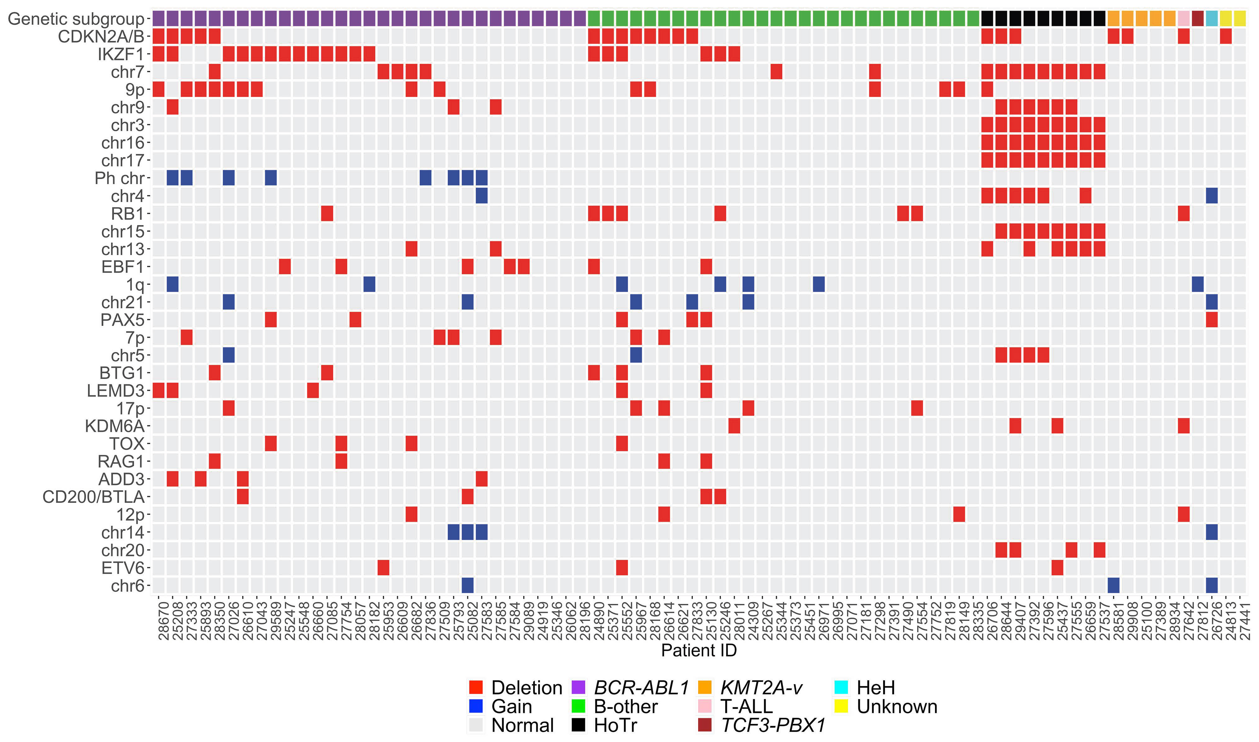 Figure 2.Complete copy number profile based on single nucleotide polymorphism array results from all 78 patients included in the single nucleotide polymorphism array cohort. Only copy number alterations present in at least three patients' samples are displayed. HoTr: low hypodiploidy/near triploidy; HeH: high hyperdiploidy; T-ALL: T-cell acute lymphoblastic leukemia; B-other: B-cell precursor acute lymphoblastic leukemia in which no primary chromosomal abnormality was identified.