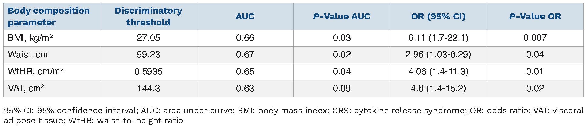 Table 3.Body mass index, waist, waist-to-height ratio and visceral adipose tissue represent independent risk factors for grade ≥2 cytokine release syndrome in a multivariate logistic regression analyses including previously described risk factors.