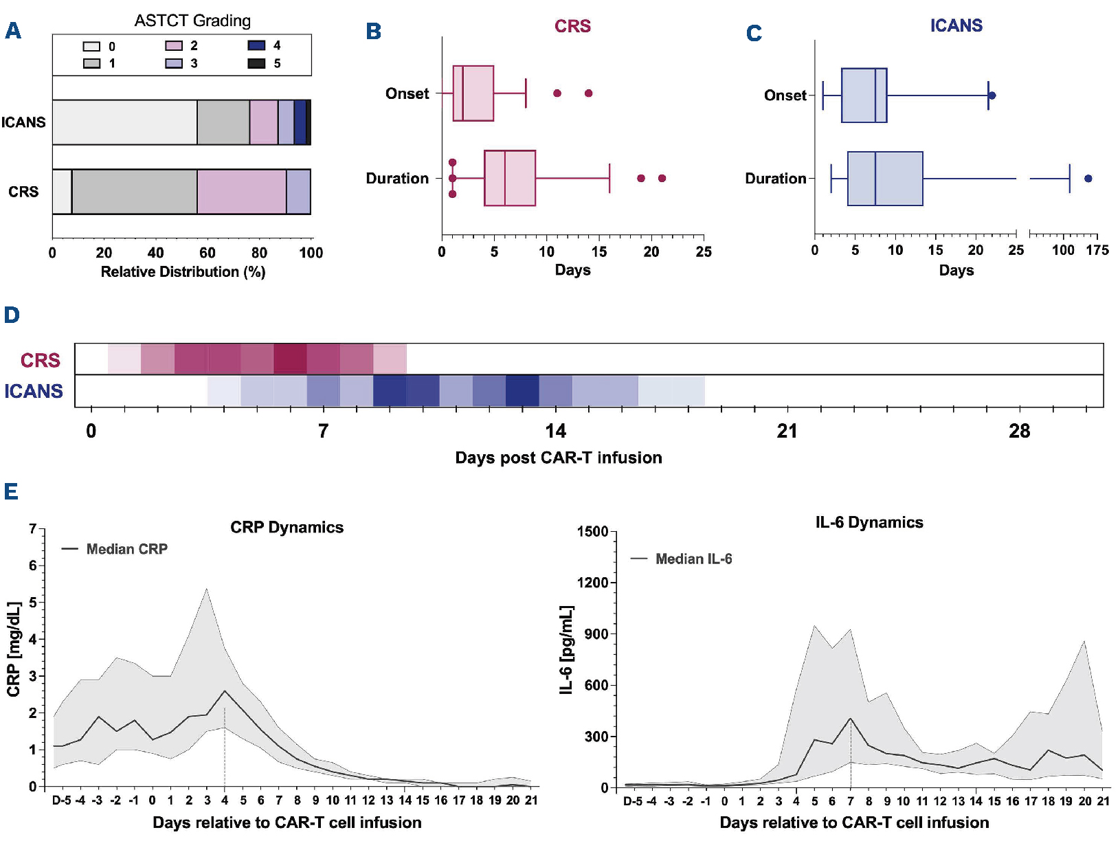 Figure 2.Incidence, onset, and duration of cytokine release syndrome and immune effector cell-associated neurotoxicity syndrome in the study cohort. (A) Relative distribution of cytokine release syndrome (CRS) and immune effector cell associated neurotoxicity syndrome (ICANS) in the studied patient cohort (n=64). Grading was performed according to American Society for Transplantation and Cellular Therapy criteria (Lee et al., BBMT 2019) with color-coding based on severity. (B to C) Box plot displaying median onset and duration of CRS (B) and ICANS (C) in days. The median is reflected by a vertical line, the box displays the interquartile range, whiskers indicate the 95% confidence interval (CI) of the median. (D) Heatmap outlining the day-by-day time course of CRS (red) and ICANS (blue) after chimeric antigen receptor T-cell (CAR-T) infusion (day 0 [D0]). Darker color indicates higher mean CRS or ICANS grade. (E) Aggregated median C-reactive protein (CRP) (left) and interleukin 6 (IL-6) (right) values over time relative to CAR-T infusion (D0). Light shading depicts the 95% CI of the median for each time point.