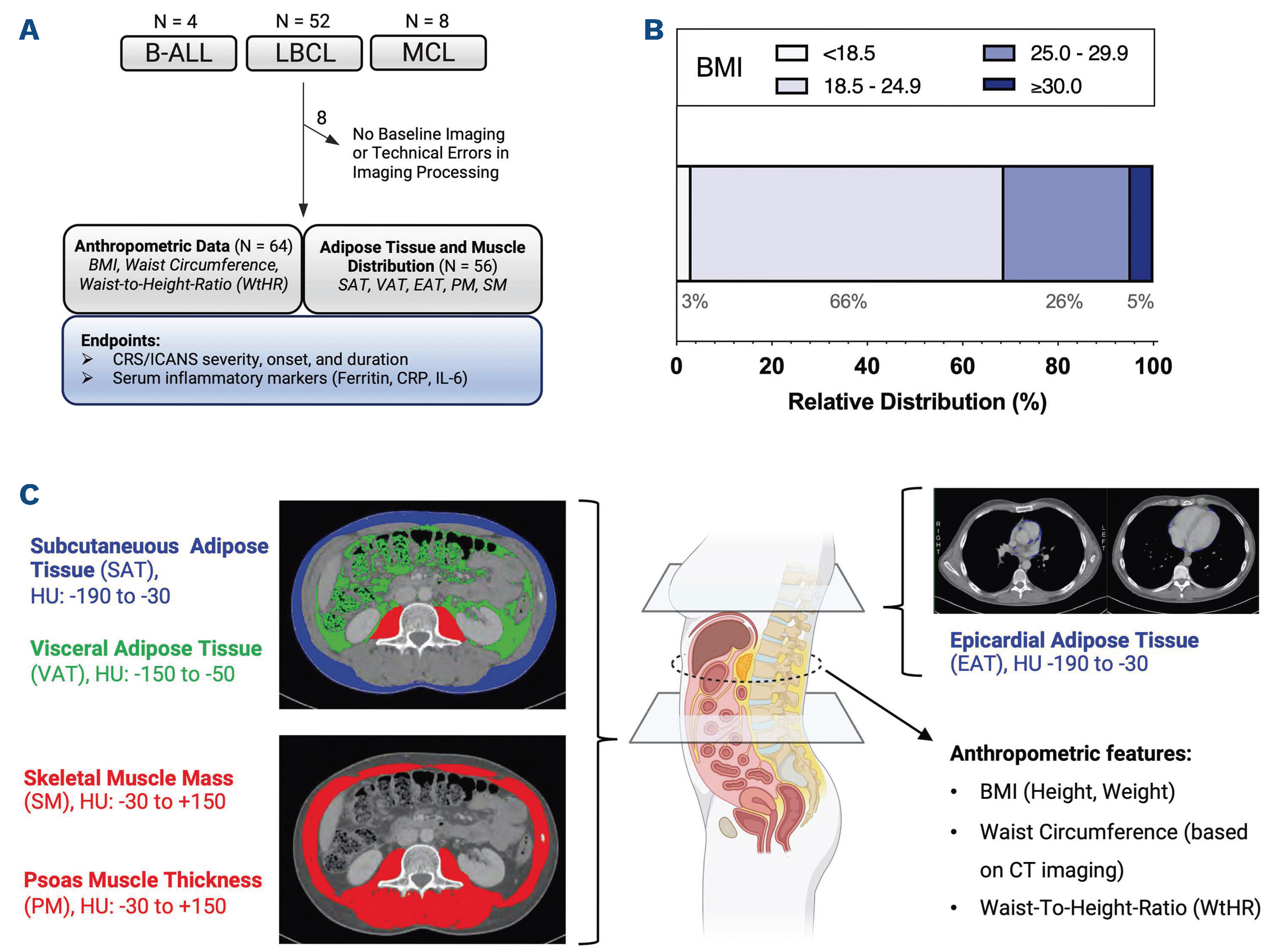 Figure 1.Measurement of prechimeric antigen receptor T-cell body composition and fat deposition. (A) Cohort description; the primary endpoint was cytokine release syndrome (CRS)/immune effector cell-associated neurotoxicity syndrome (ICANS) severity, onset, and duration; peak cytokine levels represented the exploratory endpoint. Adipose tissue and muscle distribution at baseline (= prior to lymphodepleting chemotherapy [LDC]) could not be determined in 8 patients due to lack of appropriate imaging modalities. Anthropometric data was collected for the entire study cohort (n=64). (B) Relative distribution of body mass index (BMI) according to the 2019 World Health Organization criteria (underweight <18.5 kg/m², normal weight 18.5-24.9 kg/m², overweight 25-29.9 kg/m², obese >30 kg/m²). (C) Pretreatment computerized tomography (CT) images were utilized to measure subcutaneous (SAT), epicardial (EAT) and visceral (VAT) adipose tissue deposits, as well as the psoas muscle (PM) thickness and skeletal muscle (SM) mass. SAT, VAT, PM and SM segmentation analyses were performed at lumbar spine 3 level. EAT content was quantified by calculating the mean EAT amount at the bottom, middle (4-chamber view) and top (left main coronary artery view) of the heart. Hounsfield units (HU) describing radiodensity of the respective tissue types are indicated. Anthropometric data included BMI, waist circumference (Waist), and waist-to-height ratio (WtHR).
