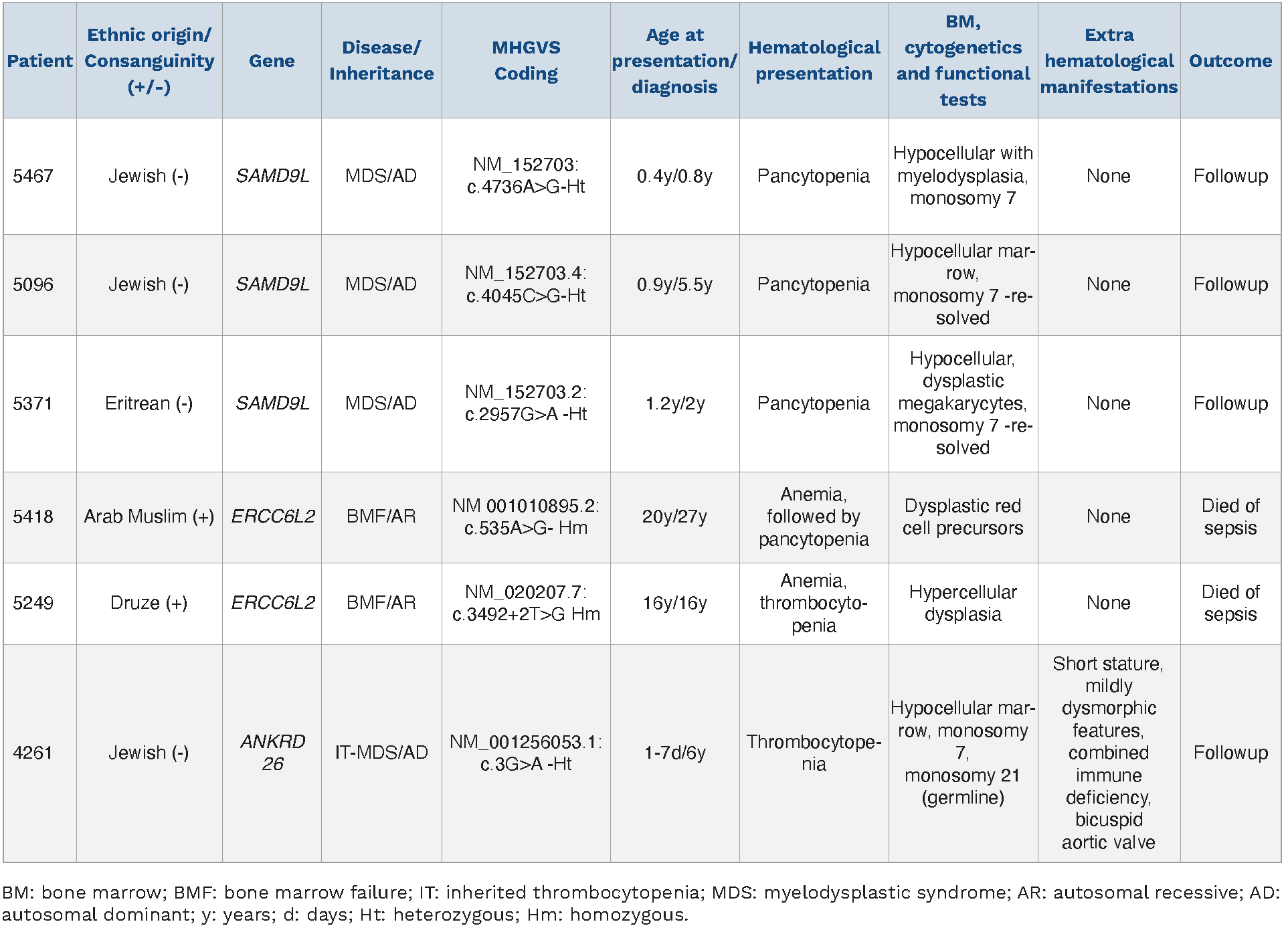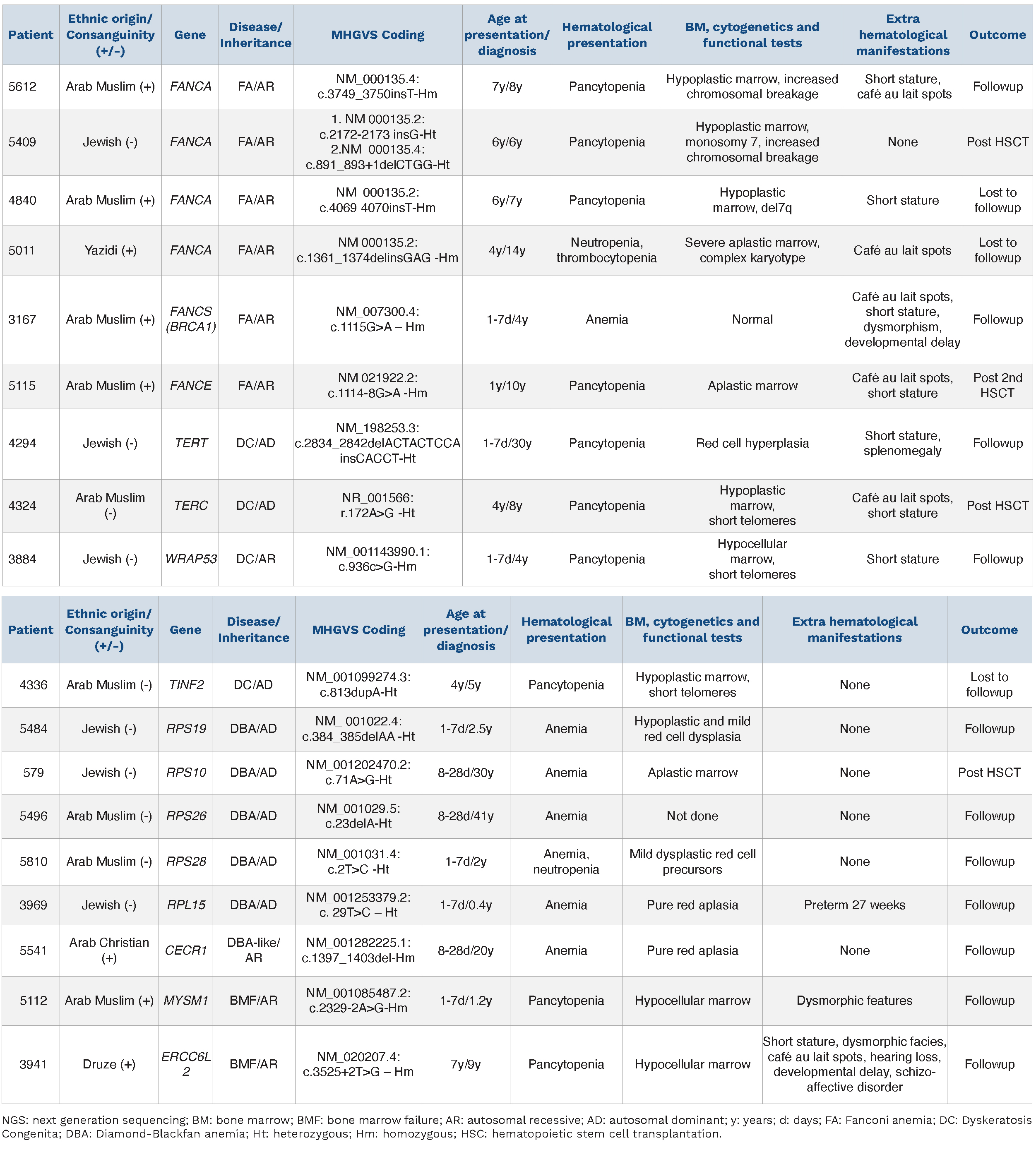 Table 2.Clinical characteristics of patients referred with the diagnosis of inherited bone marrow failure syndrome (diagnosed by Sanger sequencing).