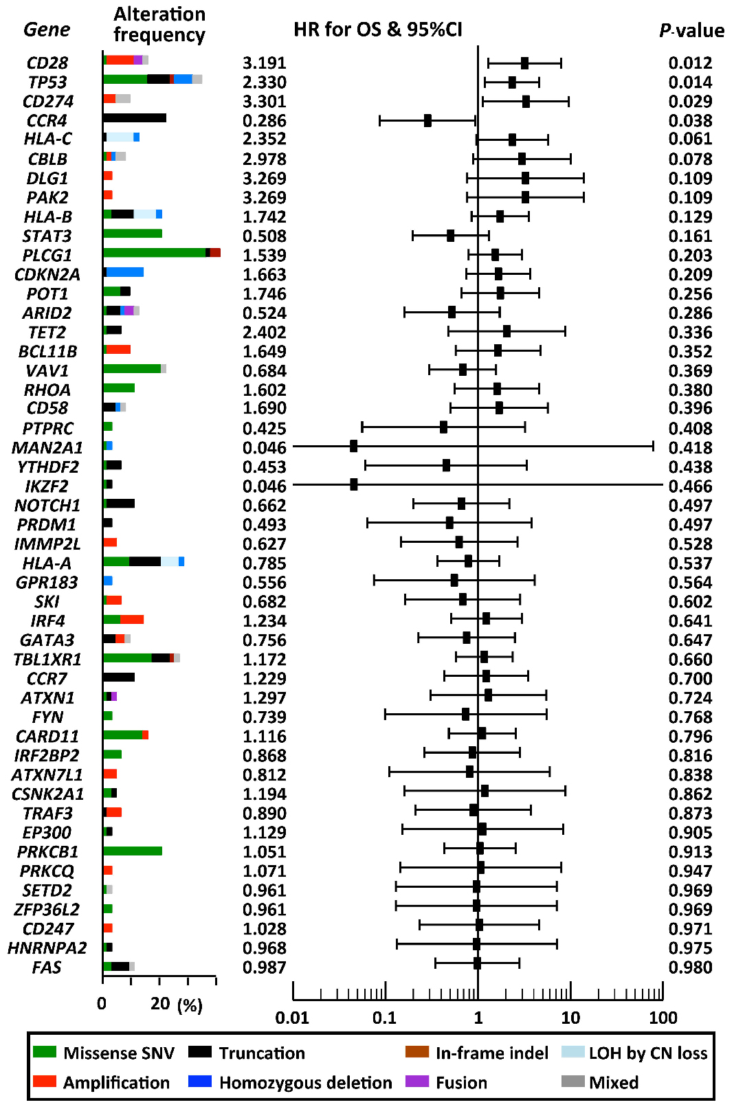 Univariate analysis of OS was also performed. It was found that patients with TP53, CD28 or CD274 alterations had poorer OS (HR: 2.330, 95% CI: 1.183-4.589; HR: 3.191, 95% CI: 1.287-7.911; HR: 3.301, 95% CI: 1.130-9.641, respectively). As with PFS, CCR4 alterations were associated with better OS (HR: 0.286, 95% CI. 0.087-0.933) (Figure 4).