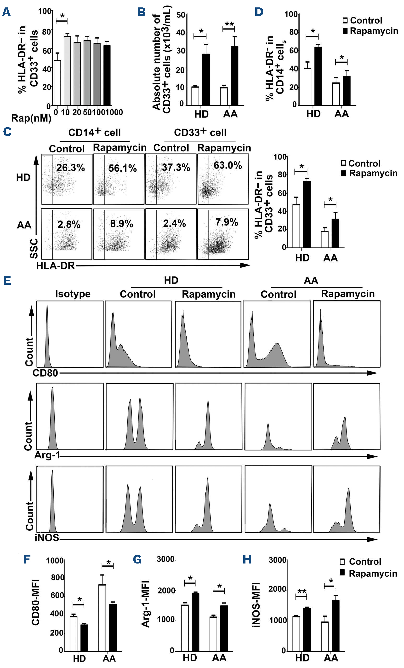 Figure 7.Rapamycin treatment increases myeloid-derived suppressor cells and improves their immunosuppressive function. (A) Rapamycin with concentration gradients from 10 to 1,000 nM stimulated the percentage of HLA-DR- in CD33+CD11b+ cells in vitro (n=5). (B) Rapamycin significantly increased the absolute number of CD33+ cells (healthy donor [HD] n=4; aplastic anemia [AA] n=4), while there was no difference for the percentage of CD33+CD11b+ cells (HD n=5; AA n=4). (C and D) Rapamycin significantly increased the percentage of HLA-DR- in CD33+CD11b+ cells and CD14+ cells (HD n=5; AA n=4). (E) Peripheral blood mononuclear cells were treated with rapamycin or dimethylsulfoxide (DMSO) (control) for 6 days before lipopolysaccharide (1 µg/mL) stimulation for 24 hours. (F) The expression of CD80 from patients with aplastic anemia (AA) and HD was detected by flow cytometry (HD n=5; AA n=5). (G and H) Expression levels of arginase (Arg)-1 (G) and inducible nitric-oxide synthase (iNOS) (H) with or without treatment of rapamycin from patients with AA and HD (HD n=5; AA n=4). All quantitative data represent mean ± standard error of the mean. *P<0.05, **P<0.01. SSC: side scatter; HLA-DR: human leukocyte antigen-D-related; Rap: rapamycin.