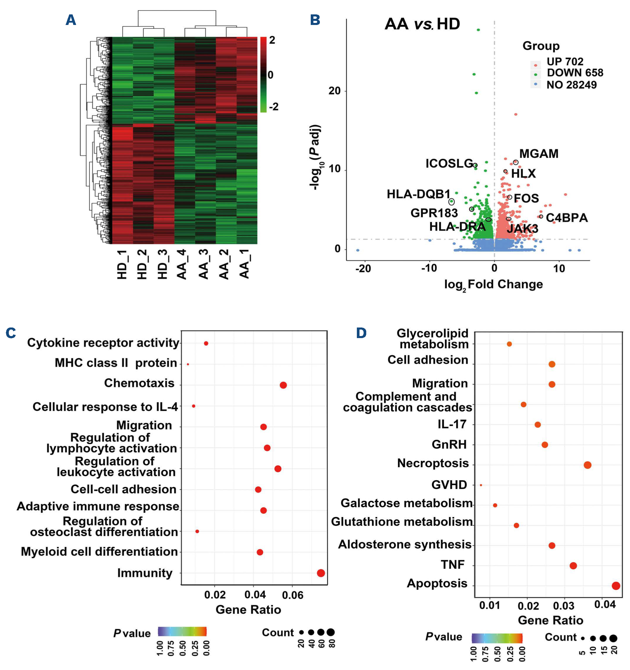 Figure 5.Gene expression patern of myeloid-derived suppressor cells in aplastic anemia patients (n=4) and healthy donors (n=3). (A) Hierarchical clustering of aplastic anemia (AA) myeloid-derived suppressor cells (MDSC) and healthy donors (HD) MDSC on differentially expressed RNA transcripts from RNA sequencing data. Each column represents a sample, and each row represents a transcript. The color gradient reveals the expression level of each transcript. (B) Volcano plot analysis shows differentially expressed genes; fold changes (>2 or <-2) with significant P values (<0.05) are highlighted in red (for upregulated genes) and green (for downregulated genes). (C and D) Gene ontology (C) and Kyoto Encyclopedia of Genes and Genomes (D) analysis show significantly upregulated and downregulated pathways involved in AA MDSC based on their functional categorization. GVHD: graft versus host disease; GnRH: gonadotropin-releasing hormone; TNF: tumor necrosis factor; IL: interleukin; NO: genes with no change in expression.