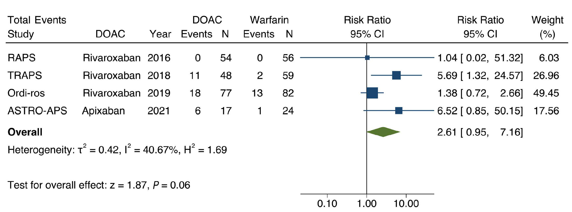Four RCT comparing DOAC and warfarin in patients with APS were selected, three with rivaroxaban and one with apixaban. A total of 468 patients were included in this meta-analysis, 231 randomized to DOAC and 237 to warfarin. The weighted mean age was 48.1 years with a higher prevalence of women (68.8%). Treatment assignment was open label in each study.