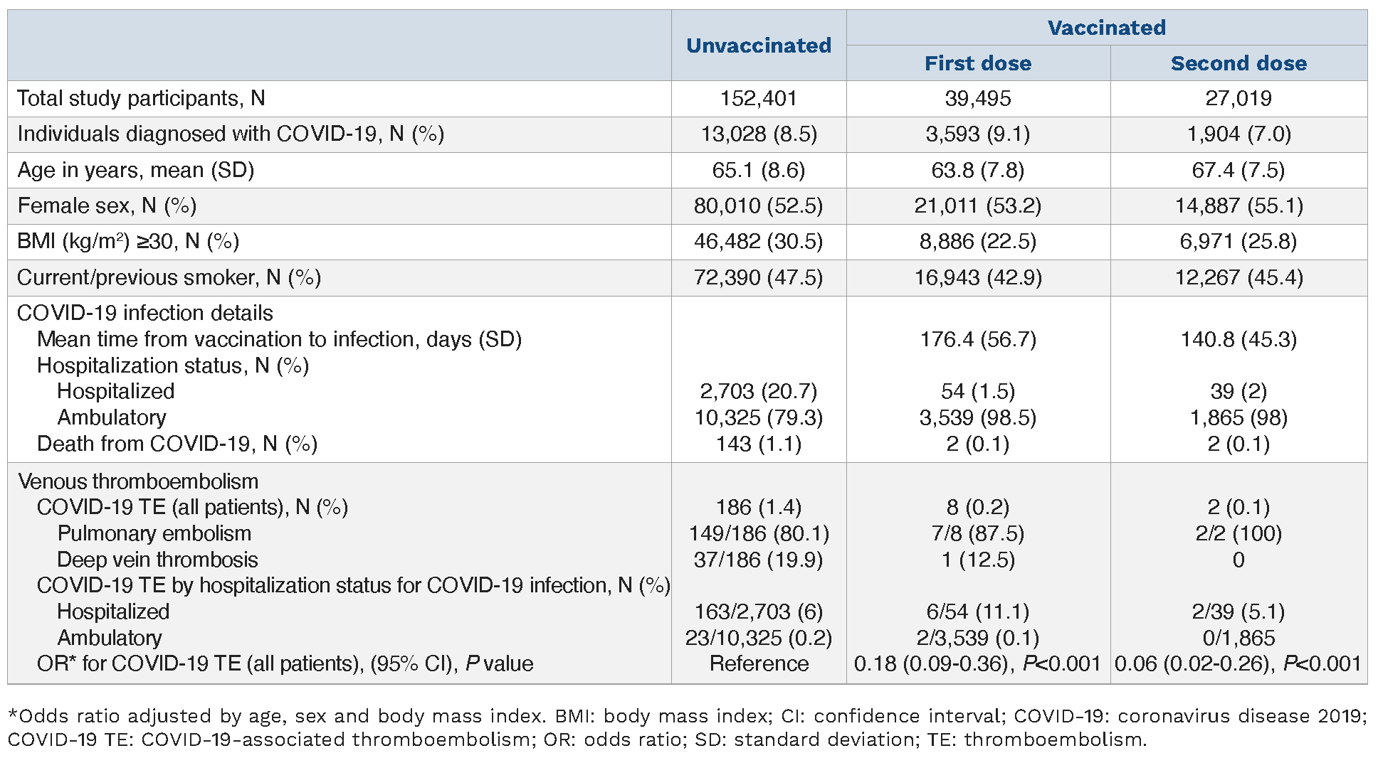 The strengths of this study include the large study size with access to free universal healthcare through the UK National Health Service, increasing the likelihood that COVID-19 therapies were consistent between cohorts. Limitations include the lack of available data regarding vaccination type, COVID-19-specific therapeutics and anticoagulation regimens prescribed to COVID-19 cases. Due to the retrospective nature of the study and the use of ICD-10 codes, the study did not capture several patient factors, such as medical comorbidities and current medical therapies, or further information regarding VTE, which includes the type of diagnostic imaging used for VTE, the specific location of DVT, or whether the events were symptomatic in nature. Moreover, our definition of hospitalization for COVID-19 may include cases where COVID-19 was an incidental finding on routine hospital testing, and not the cause for hospitalization. Whether vaccine-induced immune thrombotic thrombocytopenia (VITT) or other vaccine-related thrombotic events were captured in the vaccinated population in this study is not known. However, the mean time from COVID-19 vaccination to COVID-19 infection was 176.4 days and 140.8 days in the first and second dose cohorts, respectively, and COVID-19 TE was diagnosed up to 90 days post infection. Given that VITT is extremely rare (reported incidence ranging from 1 in 26,000 to 2.1 in 100,000 individuals following 1 dose of ChAdOx1 nCov-19 [AstraZeneca, Sydney, NSW, Australia]), and vaccine-related thrombotic events and VITT typically present within 30 days of vaccination, the likelihood of capturing these events is extremely low.10-12 Finally, the inclusion of a contemporaneous unvaccinated cohort is unable to be included due to the high vaccine coverage in the UK.