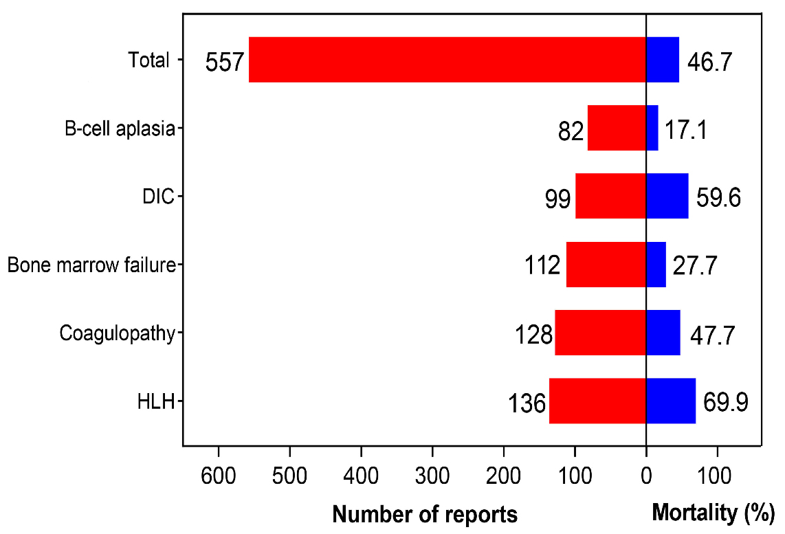Figure 5.Number of reports and mortality rates of 5 highly underestimated hematologic adverse events in clinical trials. These include B-cell aplasia, disseminated intravascular coagulation (DIC), bone marrow failure, coagulopathy, and hemophagocytic lymphohistiocytosis (HLH).
