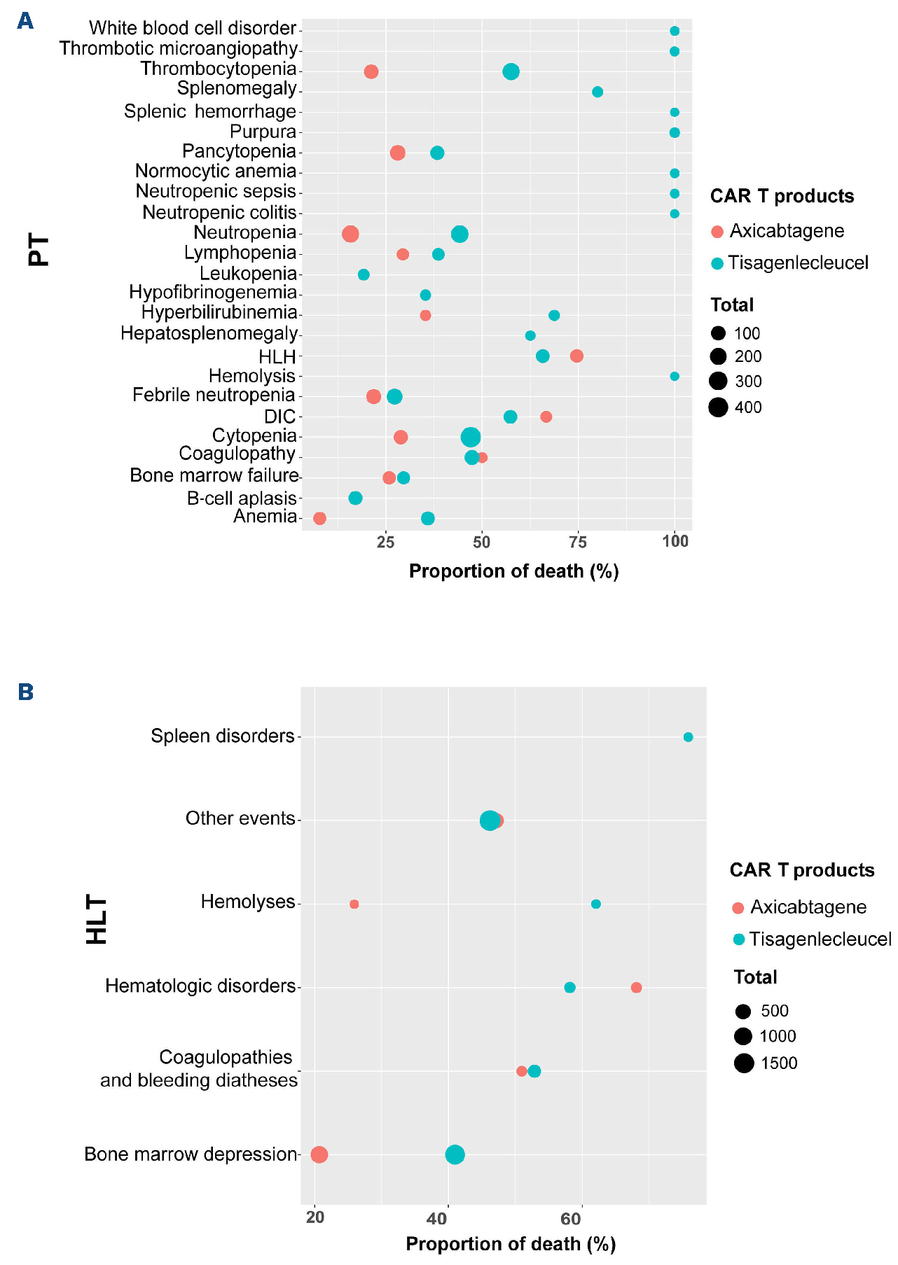 Figure 4.Mortality rates of various hematologic adverse events following axicabtagene and tisagenlecleucel therapy. (A) Proportion of death in different preferred terms (PT) of hematologic adverse events. (B) Proportion of death in different high level terms (HLT) of hematologic adverse events. DIC: disseminated intravascular coagulation; HLH: hemophagocytic lymphohistiocytosis.