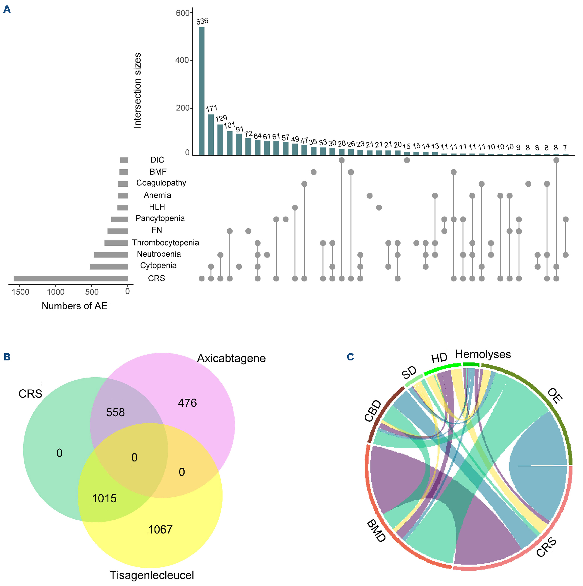 Figure 3.Correlation between cytokine release syndrome and various hematologic adverse events. (A) Overlap between cytokine release syndrome (CRS) and top 10 CAR T-associated hematologic adverse events. (B) Overlap between CRS, axicabtagene- and tisagenlecle-associated hematologic adverse events. (C) Overlap between CRS and 6 high level terms (HLT) of hematologic adverse events. CAR T: chimeric antigen receptor T cell; DIC: disseminated intravascular coagulation; HLH: hemophagocytic lymphohistiocytosis; BMD: bone marrow depression; CBD: coagulopathies and bleeding diatheses; SD: spleen disorders; HD: hematologic disorders; OE: other events.