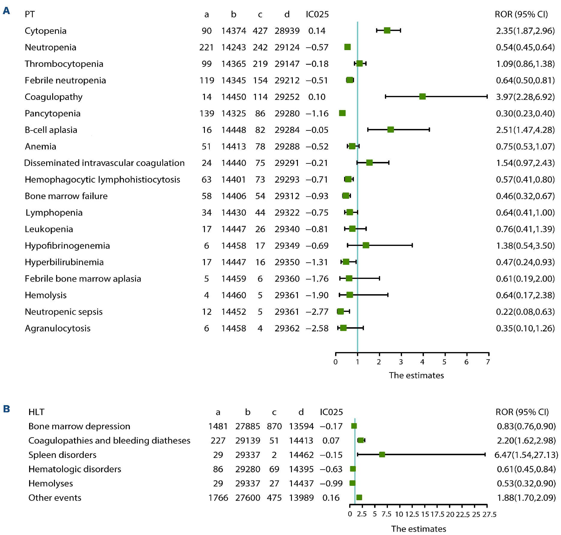 To better understand hematologic AE associated with CAR T-cell therapy, hematotoxicity PT were divided into six subgroups based on MedDRA HLT, including bone marrow depression, coagulopathies and bleeding diatheses, hematologic disorders, hemolyses, spleen disorders, and other events (Online Supplementary Table S3). Bone marrow depression, coagulopathies and bleeding diatheses, and hematologic disorders were significantly correlated with axicabtagene and tisagenlecleucel (ROR025 > 1 and IC025 > 0) (Online Supplementary Table S4). However, spleen disorders and hemolyses were significantly associated only with tisagenlecleucel and axicabtagene, respectively. Hematologic disorders (ROR025 = 11.51, IC025 = 3.45), coagulopathies and bleeding diatheses (ROR025 = 7.82, IC025 = 2.91) had the strongest signal values in AE associated with axicabtagene and tisagenlecleucel, respectively.