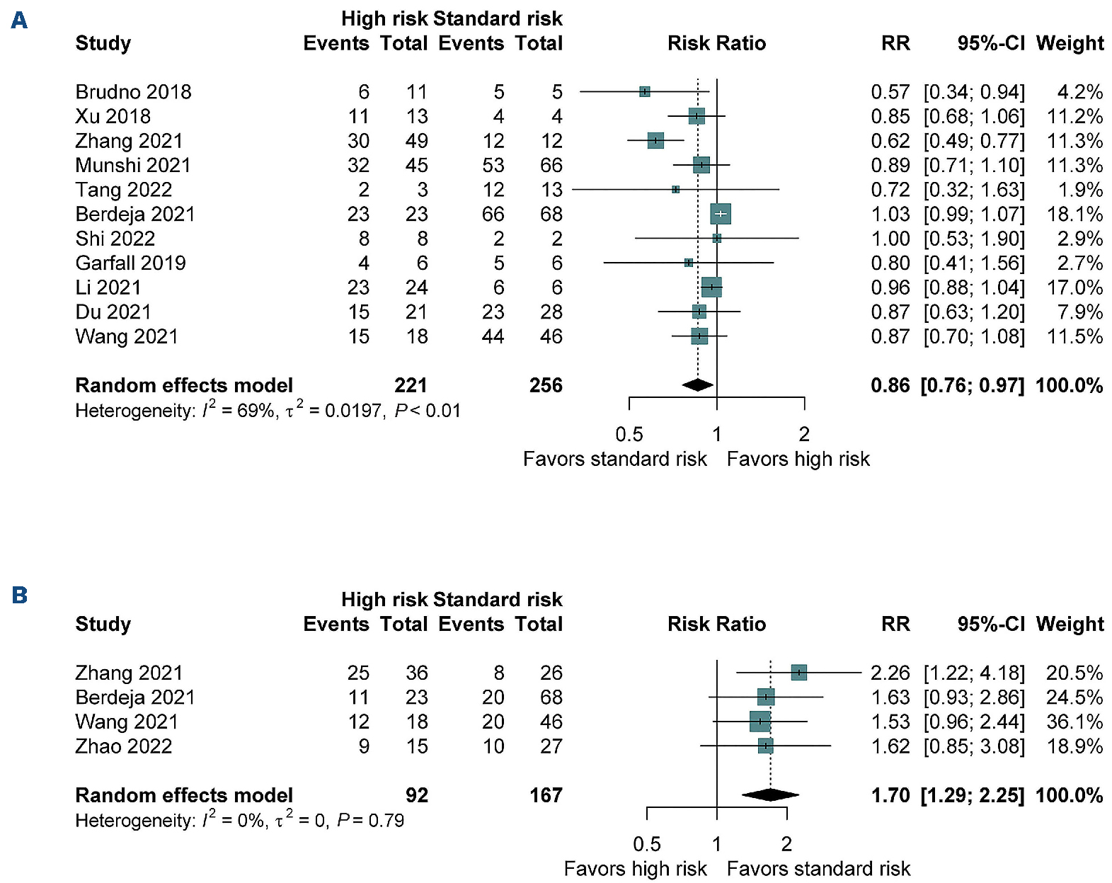Figure 2.Results of the meta-analysis of outcomes for patients with high-risk versus standard-risk cytogenetics. (A) Overall response rate. (B) Progression-free survival. RR: risk ratio; CI: confidence interval.