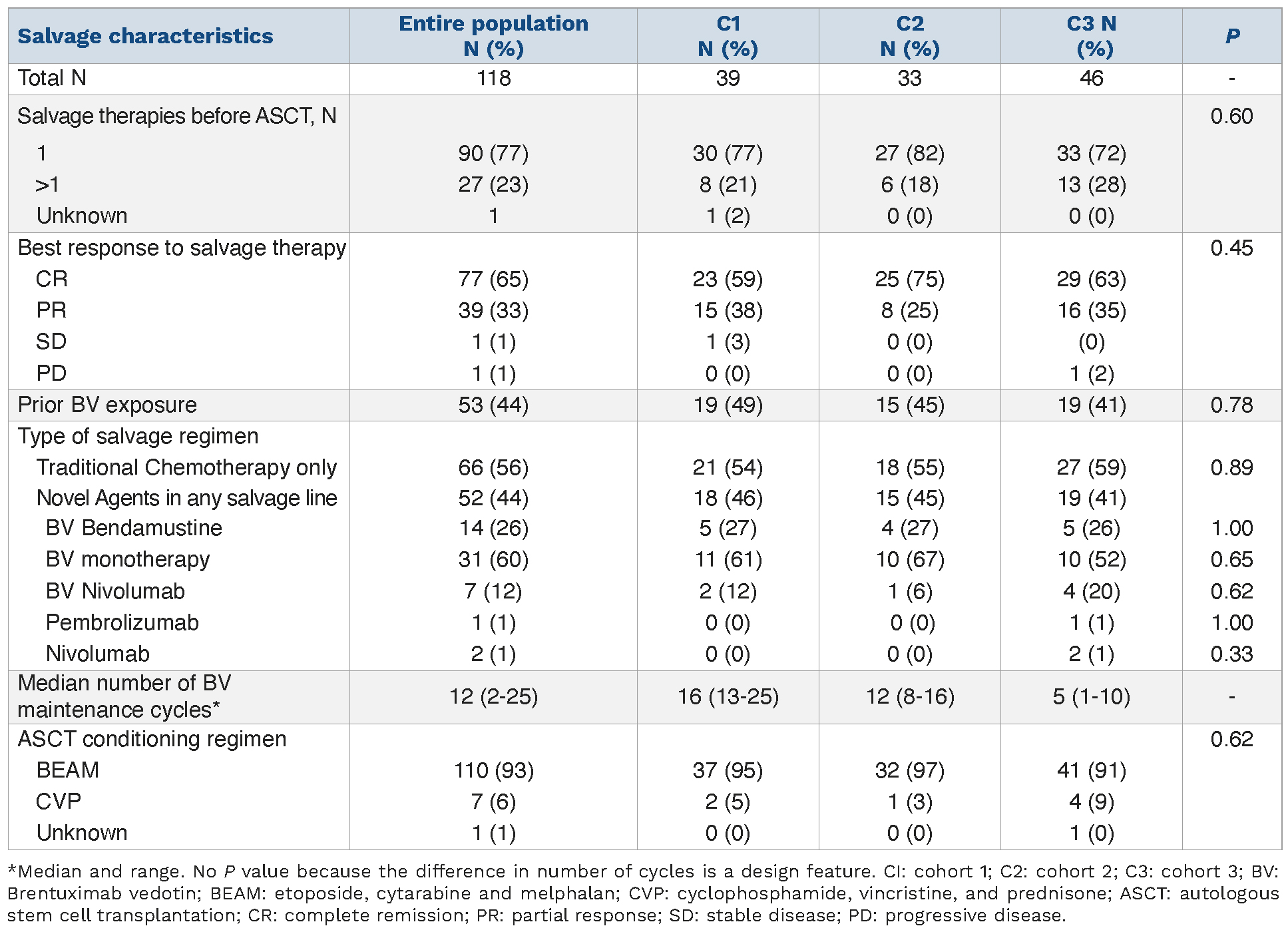 Patients on AETHERA trial had no prior exposure to BV in front-line or in the pre-ASCT salvage setting. The landscape of frontline and salvage treatment of cHL has shifted dramatically since the publication of the AETHERA trial. The ECHELON-1 trial showed both improved PFS and OS of BV-AVD compared to ABVD in frontline advanced cHL.13,14 Additionally, many phase II studies have showed excellent results with combination of BV and chemotherapy (such as ifosfamide, carboplatin, etoposide or bendamustine) during salvage before ASCT, resulting in high complete remission (CR) rates.15,16 Anti-programmed death receptor antibodies (anti-PD1) such as nivolumab or pembrolizumab have also been combined with either chemotherapy (ifosfamide, carboplatin, etoposide or gemcitabine, vinorelbine, liposomal doxorubicin) or BV for patients needing salvage therapy, also illustrating high CR rates in the range of 80-90%.17-19