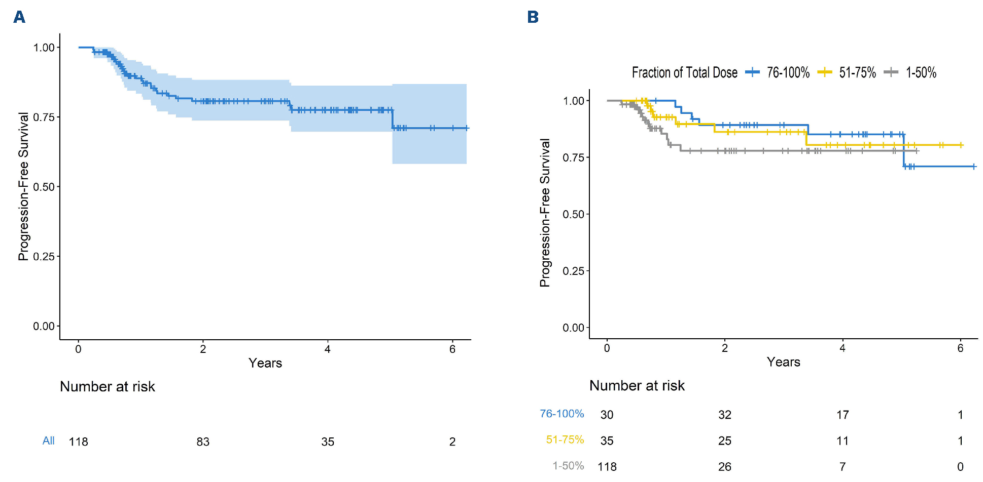 Figure 2.Two-year progression-free survival. (A) Progression-free survival of the entire study population. (B) Progression-free survival stratified by cohort, based on total planned cumulative dose, time-dependent analysis.