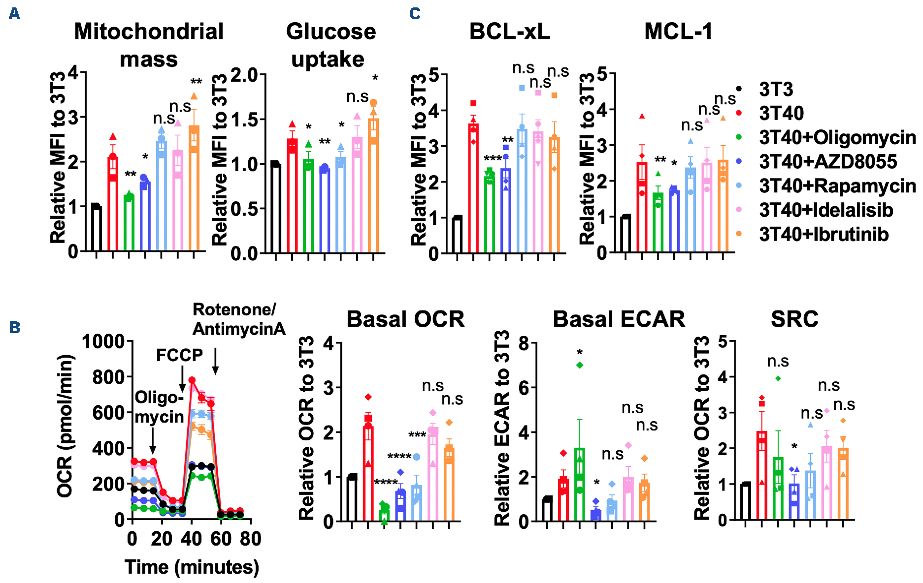Figure 4.mTOR1/2 inhibition suppresses metabolic activities and expression of BCL-XL and MCL-1. Chronic lymphocytic leukemia (CLL) cells were cultured on 3T3 or 3T40 fibroblasts and simultaneously treated with various inhibitors of downstream regulators of CD40 signaling for 24 h. After resuspension, (A) mitochondrial mass (N=3) and glucose uptake (N=3) were measured by flow cytometry. (B) A Seahorse MitoStress test was performed after CLL cells were collected (N=4), basal oxygen consumption rate, basal extracellular acidification rate and spare respiration capacity were measured and calculated. (C) Intracellular staining of BCL-xL (N=4) and MCL-1 (N=4) was done after resuspension of CLL cells and their expressions were measured by flow cytometry. Data are shown as mean ± standard error of mean. One-way analysis of variance was performed to compare culture on 3T40 fibroblasts to the other conditions. Each patient is labeled with a distinct symbol across all the conditions. *P<0.05; **P<0.01; ***P<0.001; ****P<0.0001; n.s.: not significant. MFI: mean fluorescence intensity; OCR: oxygen consumption rate; FCCP: carbonyl cyanide-p-trifluoromethoxyphenylhydrazone; ECAR: extracellular acidification rate; SCR: spare respiration capacity.