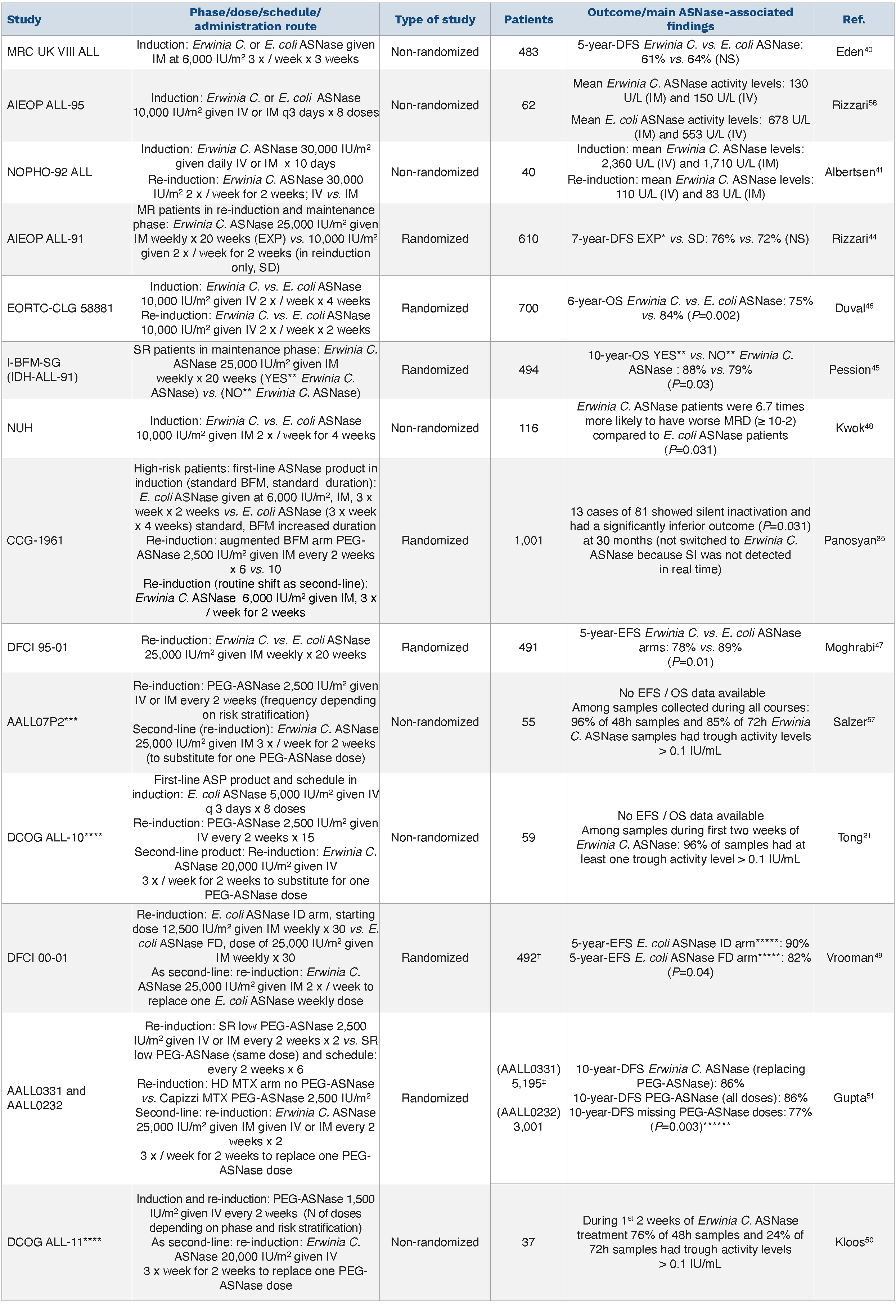 Table 1.Main findings reported in the studies featuring Erwinia c. ASNase given as first- or second-Line product.