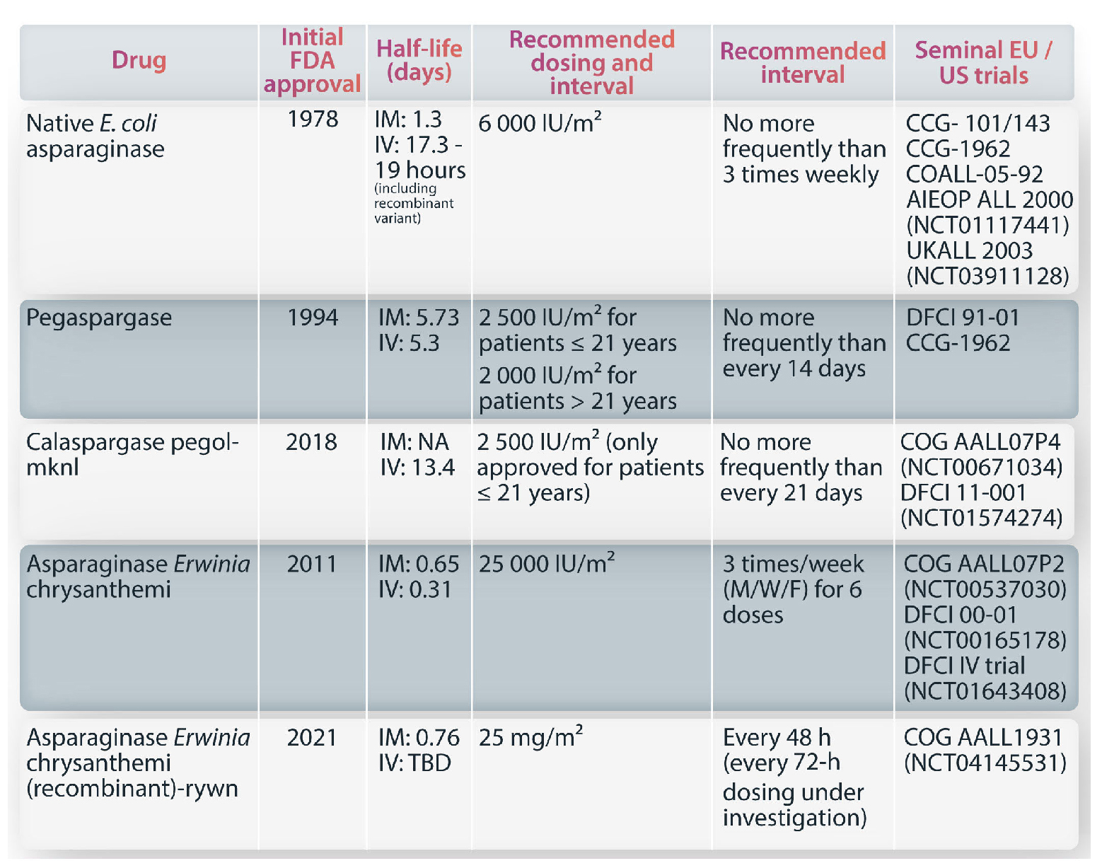 Figure 1.Different asparaginase preparations used from 1970s onwards. Each preparation is accompanied by the following information: initial FDA approval, half-life (days), recommended dosing and interval, recommended interval and seminal EU/US trials. Adapted from Maese et al. Front Pediatr 2022.62 IM; intramuscular; IV; intravenous; IU; international units; M/W/F: Monday, Wednesday, Friday schedule of dosing. The original NCT trials are available at: https://clinicaltrials.gov/.