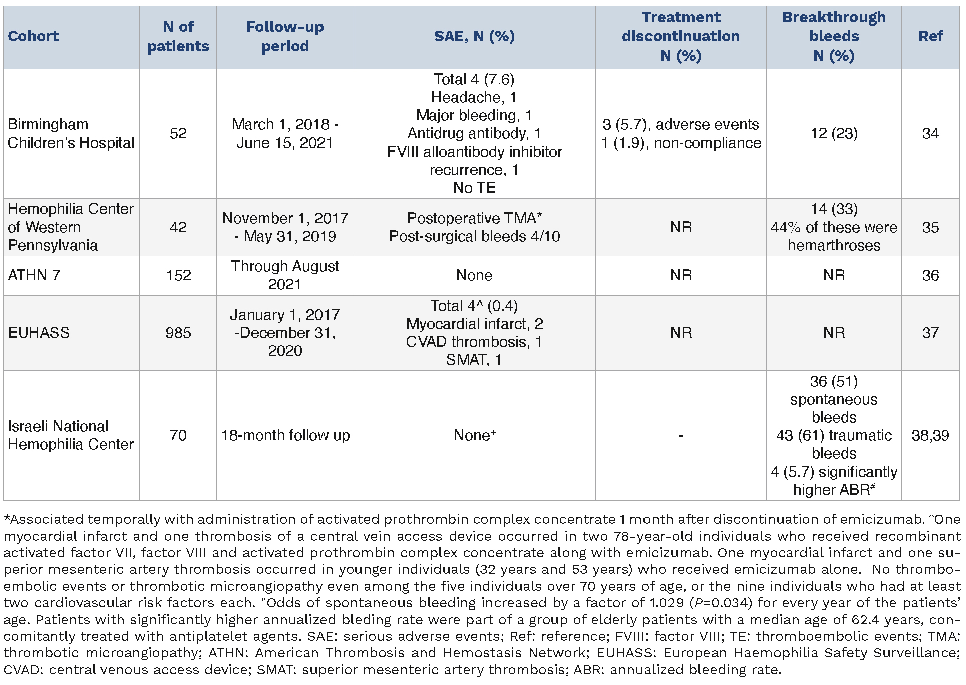 The most concerning of the adverse events reported with emicizumab during clinical trials has been the occurrence of thromboembolic events and thrombotic microangiopathy, as summarized in Table 1. Critically, these complications were associated with concomitant replacement therapy with aPCC at cumulative doses over 100 U/kg/day for more than 1 day. An updated summary of thromboembolic events documented 37 additional cases of non-aPCC-related events accumulated from post-marketing reports and registries as of May, 2021.33 Of these, 92% occurred in patients with pre-existing cardiovascular or thrombotic risk factors, including age over 50; 17 (45.9%) occurred in patients with inhibitors, and seven (18.9%) were associated with thrombotic occlusion of a central venous access device. Only six of the 30 individuals with non-thromboembolic events not related to a central venous access device discontinued their emicizumab prophylaxis. There were four deaths in this cohort: two patients with myocardial infarction and two elderly individuals over 70 years old with pneumonia and disseminated intravascular coagulation. Robust real-world and long-term experience with emicizumab is summarized in Table 3.34-39 No pediatric participants have experienced thromboembolic events in the HAVEN trials and no pediatric deaths have been reported in the HAVEN series. In contrast, the real-world use of emicizumab has been associated with the death of an Israeli child, who died after developing a central venous access device-related thrombosis.30 Undoubtedly, with the rapid worldwide uptake of emicizumab prophylaxis regimens in HA, additional reports of thrombotic morbidity and mortality will emerge. The use of registries will be critical to monitor the safety of this and other non-factor replacement strategies. It also highlights the fact that emicizumab may not be the optimal treatment strategy for all individuals with HA with or without inhibitors and that careful selection of patients will be necessary to achieve favorable risk/benefit outcomes. The black box warnings required by the FDA in the drug’s package insert serve as a reminder that the use of emicizumab may carry both known and unanticipated risks.