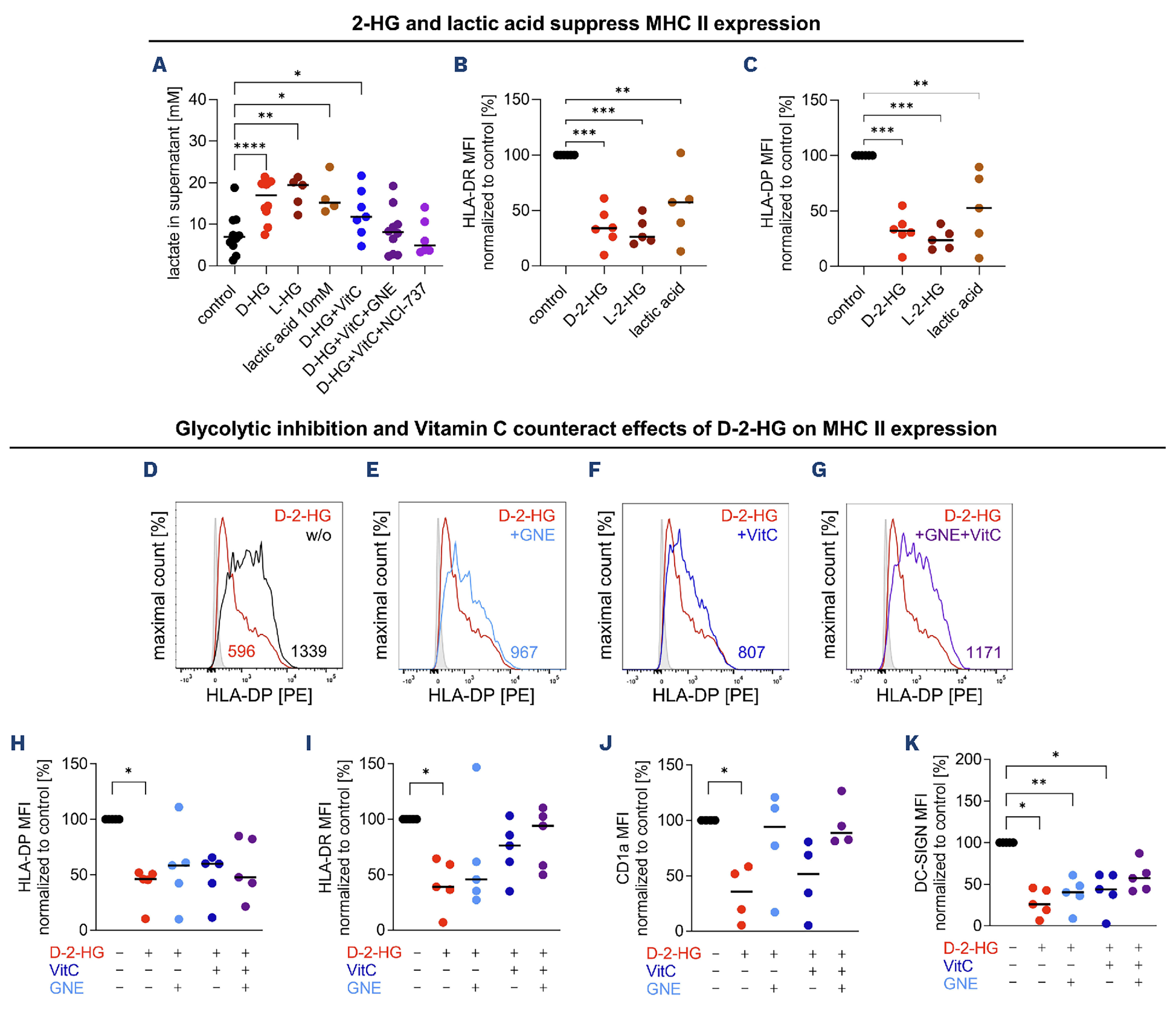 Figure 3.Vitamin C and lactate dehydrogenase inhibitor treatment counteract D-2-hydroxyglutarate-induced effects. (A) Scatter plot showing lactate level in supernatants of dendritic cells (DC) treated with 20 mM D-2-hydroxyglutarate (D-2-HG) or L-2-hydroxyglutarate (L-2-HG) or 10 mM lactic acid (started on day 0), 1 mM vitamin C (VitC, started on day 0) plus the lactate dehydrogenase inhibitor GNE140 (1 µM, started on day 2), and 1 mM VitC plus the lactate dehydrogenase inhibitor NCI-737 (0.1 µM, started on day 2) for 7 days. (B) HLA-DR and (C) HLA-DP expression on DC treated for 7 days with D-2-HG, L-2-HG or 10 mM lactic acid was analyzed by flow cytometry. (D-G) Representative histograms of HLA-DP expression in DC treated with D-2-HG and inhibitors (1 mM Vit C, 1 µM GNE140) as indicated in the Figure. Numbers indicate median fluorescence intensity values. (H) HLA-DP (N=5), (I) HLA-DR (N=5), (J) CD1a (N=4) and (K) DC-SIGN (N=4) surface expression on DC cultured with D-2-HG and inhibitors (1 mM VitC, 1 µM GNE140) as indicated in the Figure and analyzed by flow cytometry. Symbols represent individual donors analyzed in independent experiments and horizontal bars mark median values. For multiple-group comparisons, one way analysis of variance and a post-hoc Dunnett, Friedman or Dunn test were performed. P<0.05 was considered statistically significant (*P<0.05, **P<0.01, ***P<0.001, ****P<0.0001). MFI: mean fluorescence intensity; GNE: GNE140.