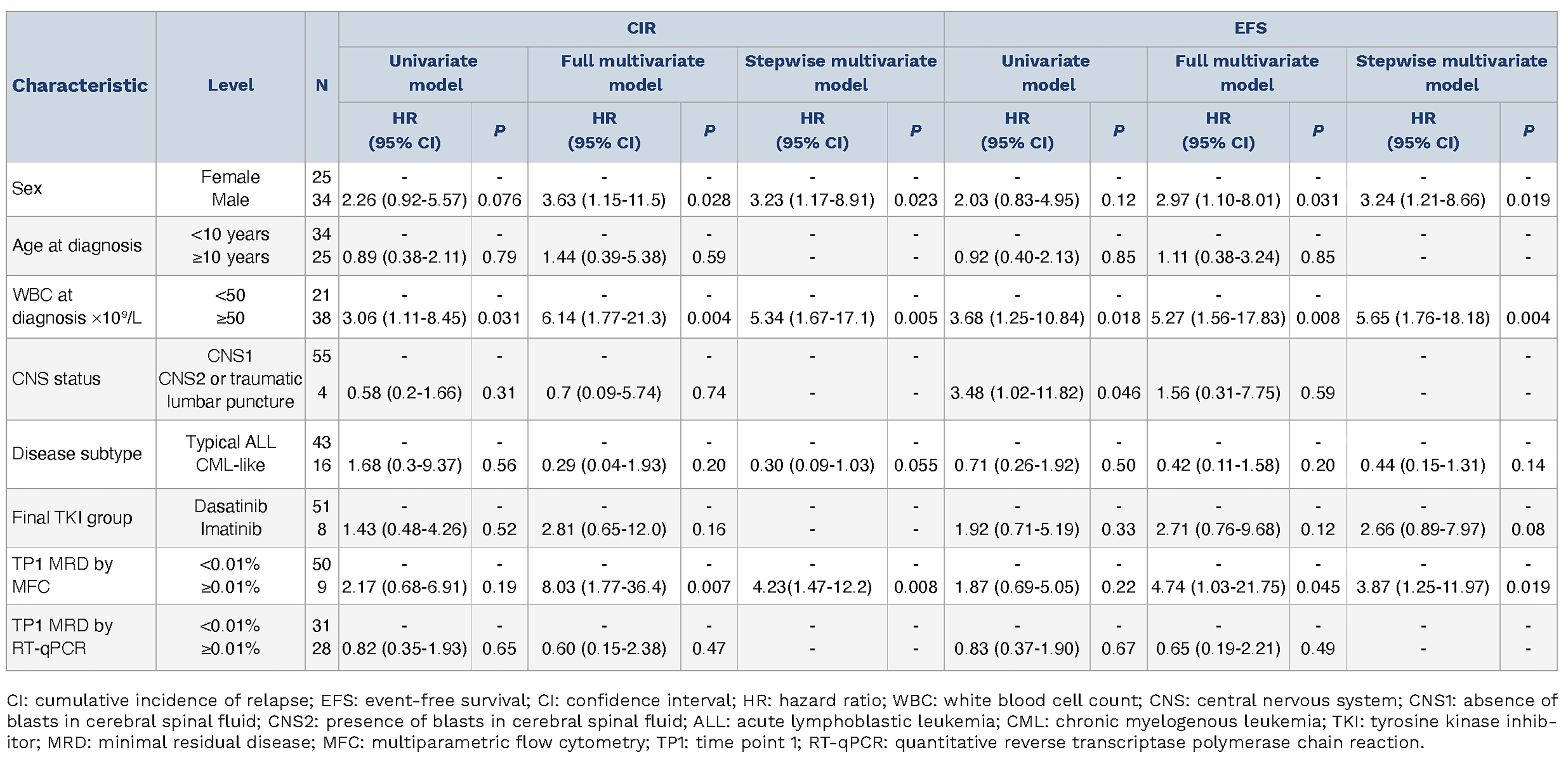 Children under 18 years old with Ph-positive ALL and no previous treatment were enrolled in the CCCG-ALL-2015 trial which was detailed in a previous study7 Bone marrow (BM) evaluations were done at day 19 (D19) and day 46 (TP1) of induction, end of consolidation (TP2), before re-induction (TP3), completion of five cycles of subsequent continuation (TP4) and treatment completion (TP5). RT-qPCR was conducted in accordance with the guidelines by the Europe Against Cancer program.8 Immunophenotype analyses were performed on at least 5×106 nucleated cells by FACS CantoII flow cytometer (BD Biosciences). Both assays achieved a detection sensitivity of 10-4 (0.01%). Non-quantifiable positive and negative results were given the value of 10-5 and 10-6, respectively. We considered two samples discordant if the MRD levels differed by >1 log. Patients with more than one discordant MRD sample were classified as CML-like. BM relapse was defined as BM blasts ≥5% by morphology after achieving complete response (CR) and confirmed by MFC and molecular testing. Central nervous system 1 (CNS1) was defined as absence of blasts in cerebral spinal fluid (CSF). CNS2 was defined as presence of blasts in CSF but white blood cell count <5/microliter. CNS relapse was defined as recurrence of CNS leukemia detected by MFC. Molecular relapse was defined as a 2-log or greater increase in MRD measured by RT-qPCR. Cumulative incidence of relapse (CIR) was measured from CR to relapse of any site. The competing event for CIR was death in remission. Event-free survival (EFS) was measured from diagnosis to relapse, or death from any cause, whichever came first. Overall survival (OS) was measured from diagnosis to death from any cause. Continuous and categorical variables were compared by Mann-Whitney U test and Fisher’s exact test, respectively. Uni- and multivariate regression analyses of EFS and CIR were performed using the Cox and Fine-Gray regression models. We adopted two strategies to derive a multivariate model: i) full model incorporating all variables and ii) stepwise regression model by backward selection using Akaike information criterion. Analyses were primarily based on as-treated, but secondary analyses for intention-to-treat were performed as well. Two-sided P values <0.05 were considered statistically significant. All statistical analyses were performed by R statistical software version 4.2.2 (www.r-project.org). This study complied with the principles of the Declaration of Helsinki. Approval was obtained from the Ethics Committee and Institutional Review Board of the Institute of Hematology and Blood Diseases Hospital, Chinese Academy of Medical Sciences (IRB number: IIT-2015010-EC-1).