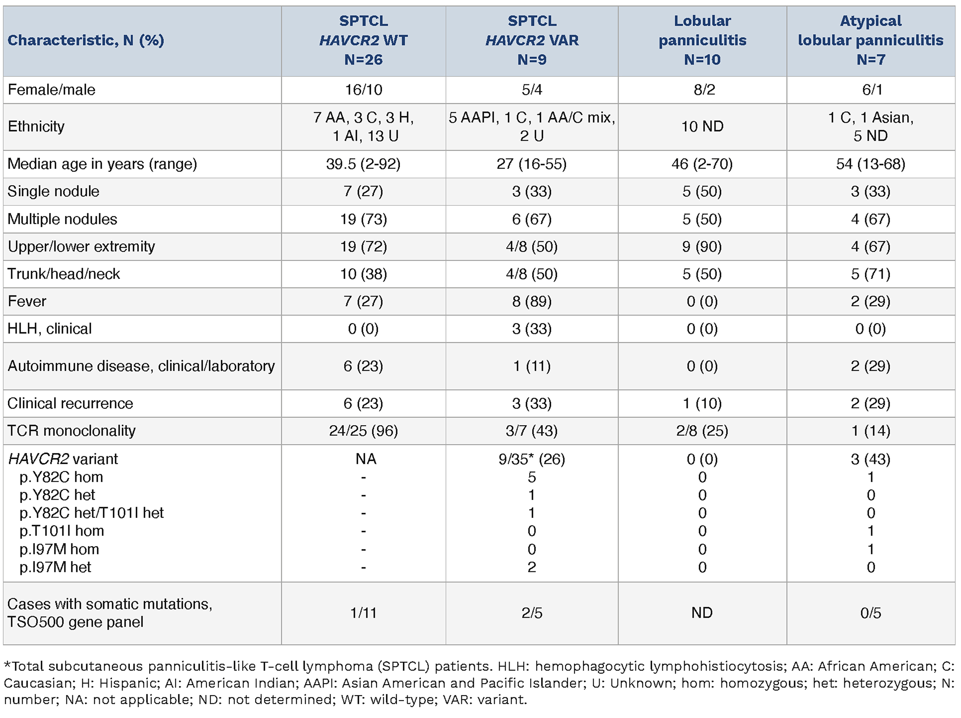Hepatitis A Virus Cellular Receptor 2 (HAVCR2/TIM3) encodes a transmembrane protein expressed by T cells and natural killer cells that acts as a negative immune checkpoint inhibitor.7,8 Recently, the presence of germline inactivating / hypomorphic variants of HAVCR2 (p.Y82C, p.I97M and p.T101I) have been linked to SPTCL primarily in patients of Asian ethnicity.7,9-12 Patients with these variants have a higher risk of developing HLH. Most published studies are from Asian countries, with one large study from France.7,9-12 To date, there have been no studies evaluating HAVCR2 germline variants from North America, and mutational studies of related lesions have not been reported. We investigated the incidence of HAVCR2 germline variants in a mixed-ethnicity North American cohort of patients with SPTCL and other pathological conditions manifesting morphologically as LP, and correlated their presence with available clinical, pathological, and molecular features.