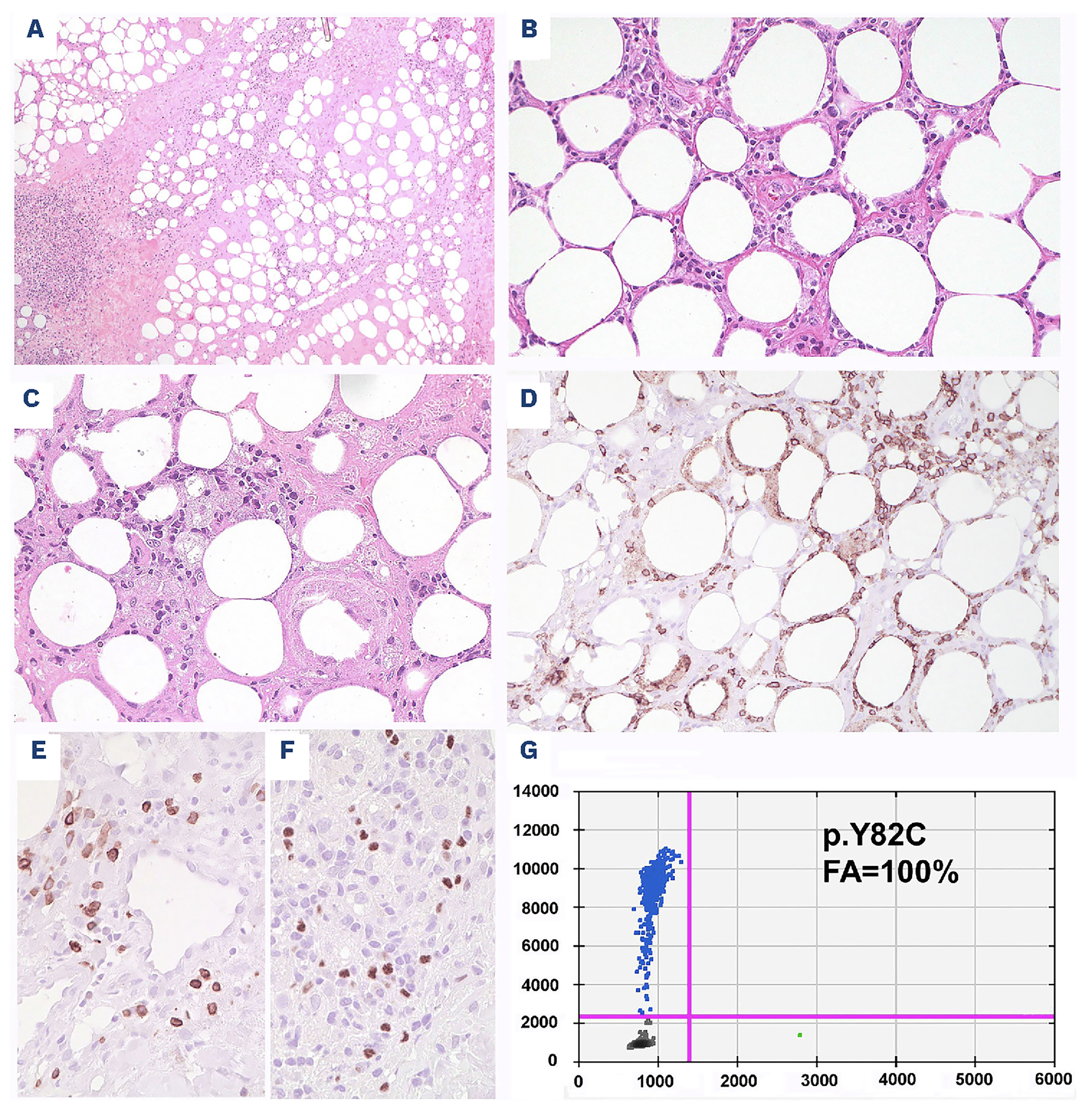 Figure 2.Representative case of atypical lobular panniculitis with HAVCR2 germline variants. (A) Biopsy obtained from a 47-year-old female (Case 1) with atypical lobular panniculitis (ALP) shows a patchy lymphoplasmacytic infiltrate involving the adipose tissue (H&E, 20X). There is fibrinoid change with relatively sparse cellularity. (B) Focal areas show more numerous lymphoid cells with focal rimming of fat spaces (H&E, 200X). (C) Focal clusters of plasma cells are present (H&E, 400X). (D) A stain for CD8 highlights T cells rimming fat spaces (IHC, 400X). (E) Plasma cells are stained by CD79a (IHC, 400X). (F) TCF-4 stains plasmacytoid cells, favoring a diagnosis of ALP (IHC, 400X). (G) ddPCR detected homozygous HAVCR2 p.Y82C germline variant. T-cell gene rearrangements were oligoclonal (not shown). FA: fractional abundance; H&E: Hematoxylin&Eosin staining; IHC: immunohistochemistry.