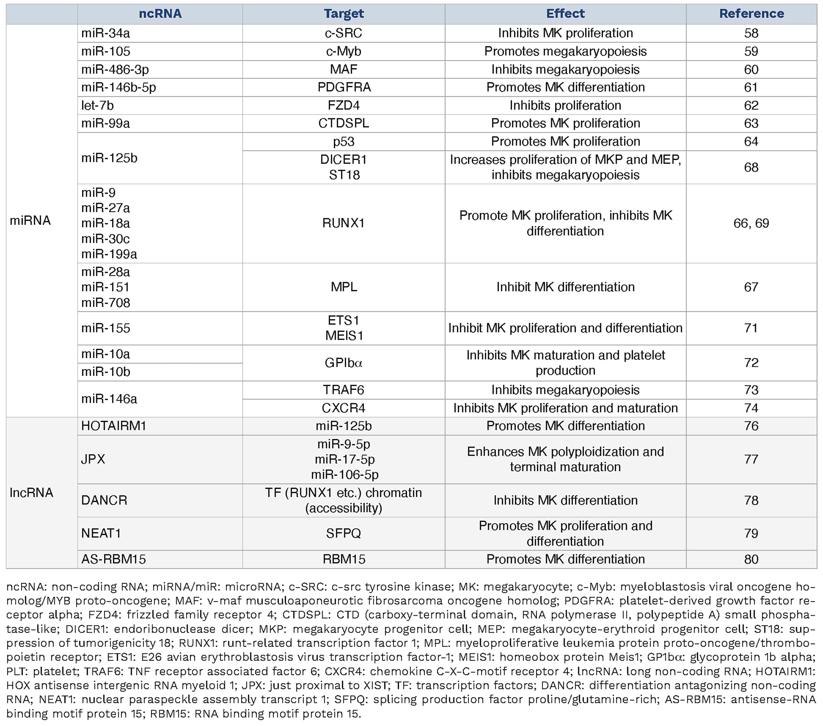 Table 1.Several non-coding RNA and their influences on megakaryopoiesis and platelet formation.