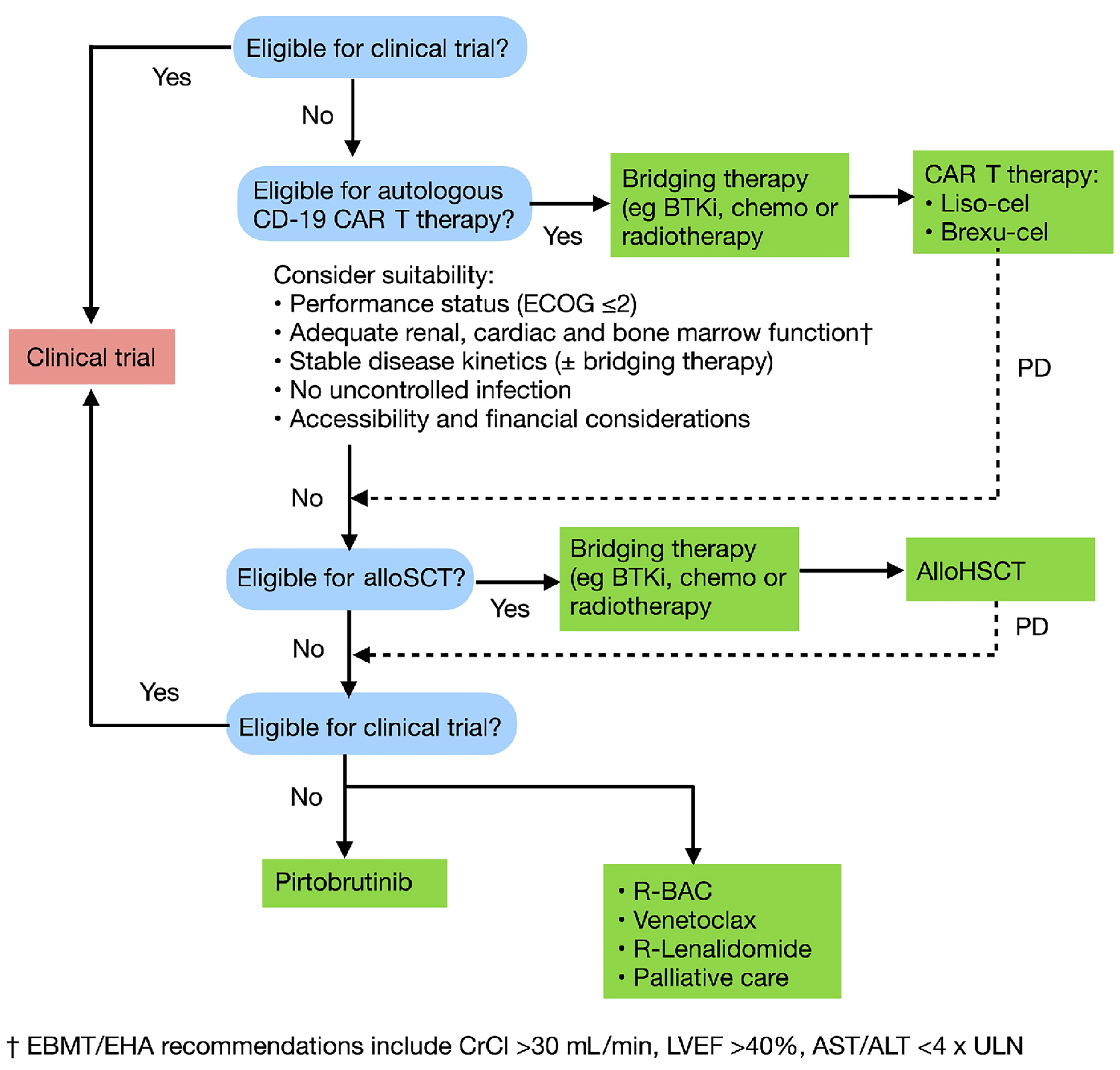 Figure 2.Suggested treatment algorithm for covalent Bruton’s tyrosine kinase inhibitors relapsed refractory mantle cell lymphoma. CAR T: chimeric antigen receptor T cell; BTKi: Bruton’s tyrosine kinase inhibitors; ECOG: Eastern Cooperative Oncology Group; PD: progressive disease; alloSCT: allogeneic stem cell transplantation; R-BAC: rituximab, bendamustine and cytarabine.