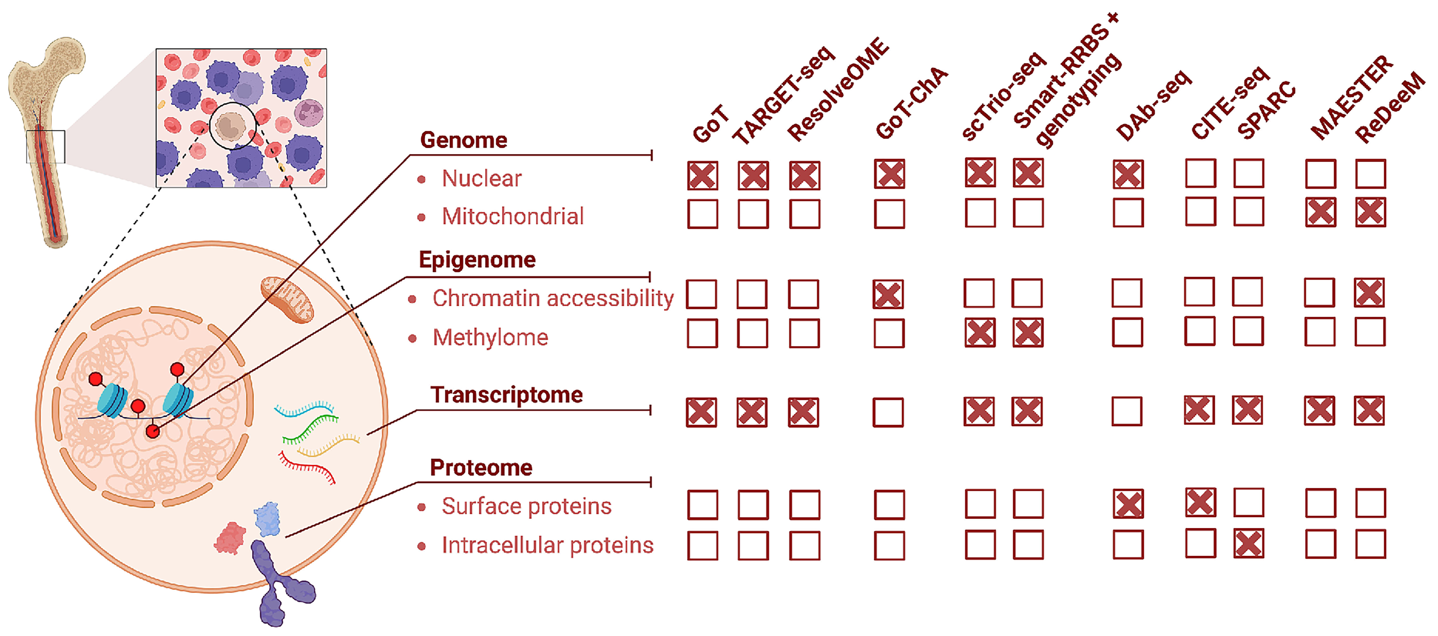 Figure 3.Summary of capabilities across multi-modal single-cell platforms. GoT: genotyping of transcriptomes; GoT-ChA: genotyping of targeted loci with single-cell chromatin accessibility; scTrio-seq: single-cell triple-omics sequencing; Smart-RRBS: Smart-seq2 and reduced representation bisulfite sequencing; DAb-seq: DNA-antibody sequencing; CITE-seq: cellular indexing of transcriptomes and epitopes by sequencing; SPARC: single-cell protein and RNA co-profiling; MAESTER: mitochondrial alteration enrichment from single-cell transcriptomes to establish relatedness; ReDeeM: regulatory multimaps with deep mitochondrial mutation profiling.
