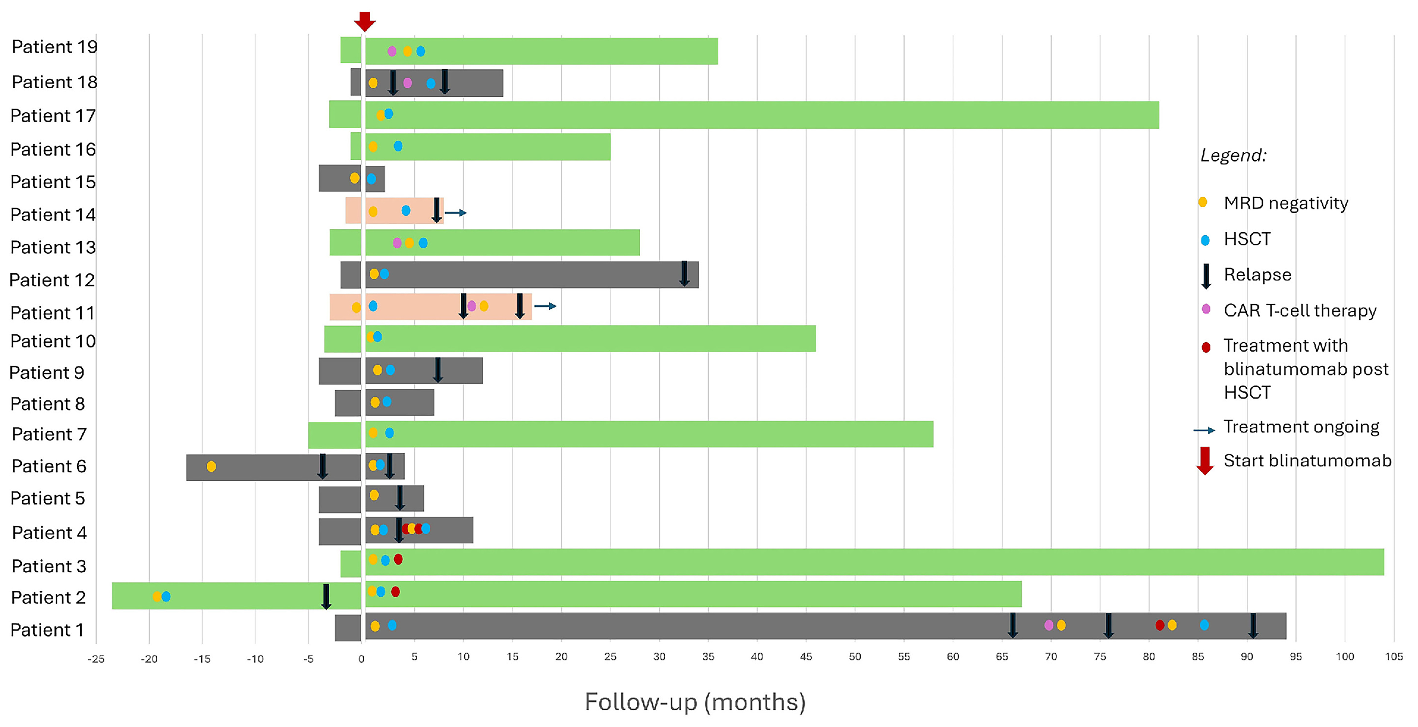 Five patients also received CAR T-cell therapy, either as therapy of relapse after blinatumomab-HSCT (patients 1 and 11) or before HSCT due to non-response to or early relapse after blinatumomab (patients 13, 19 and 18 respectively). These findings indicate that CD19-directed CAR T-cell therapy remains a feasible treatment option even following post-blinatumomab.