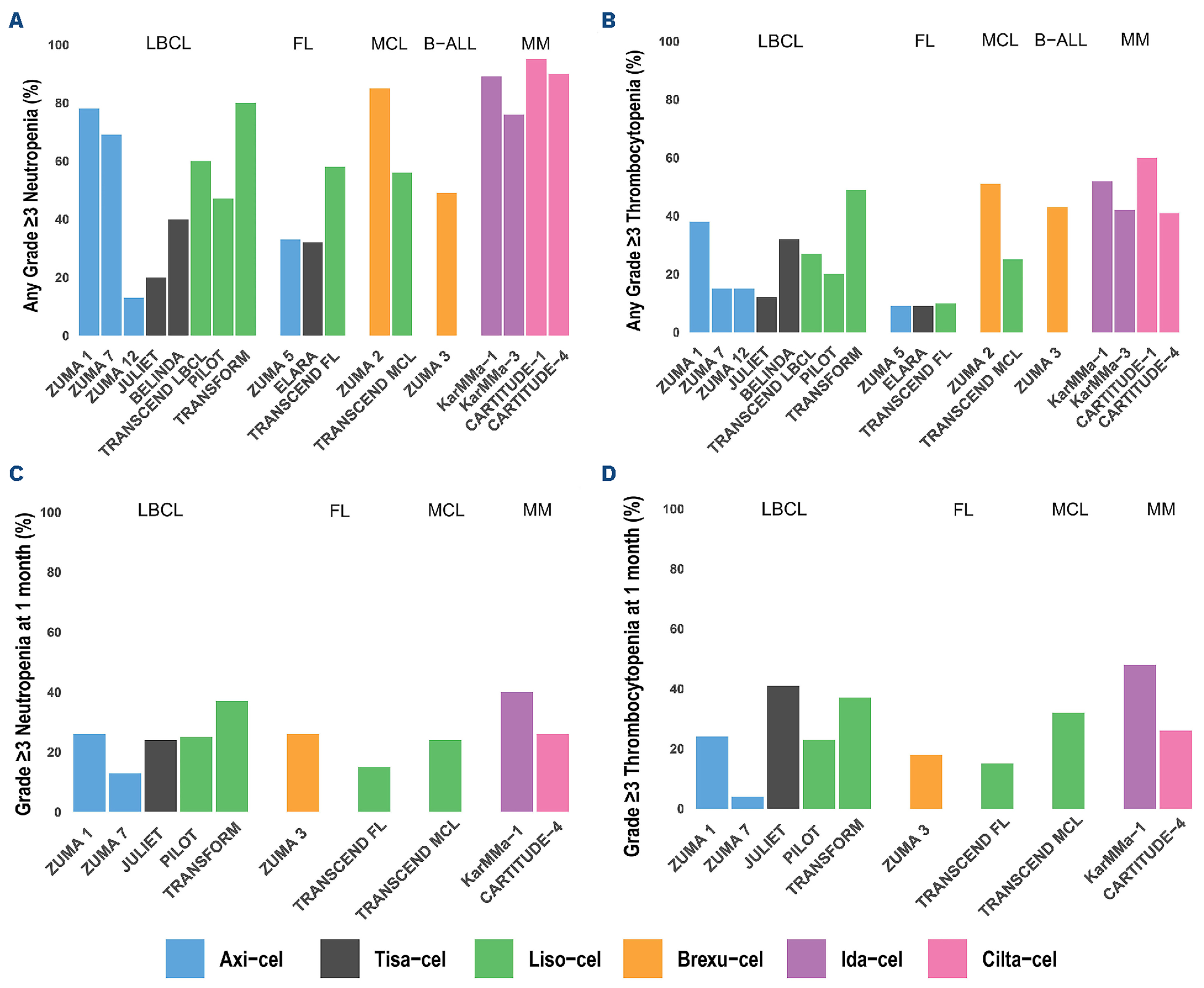Any grade ≥3 neutropenia. (B) Any grade ≥3 thrombocytopenia. (C) Grade ≥3 neutropenia at 1 month. (D) Grade ≥3 thrombocytopenia at 1 month. The ZUMA 5 trial included patients with follicular and marginal zone lymphoma. LBCL: large B-cell lymphoma; FL: follicular lymphoma; MCL: mantle cell lymphoma; B-ALL: B cell acute lymphoblastic leukemia; MM: multiple myeloma; Axicel: axicabtagene ciloleucel; Tisa-cel: tisagenlecleucel; Liso-cel: lisocabtagene maraleucel; Brexu-cel: brexucabtagene autoleucel; Ida-cel: Idecabtagene vicleucel; Cilta-cel: ciltacabtagene autoleucel.