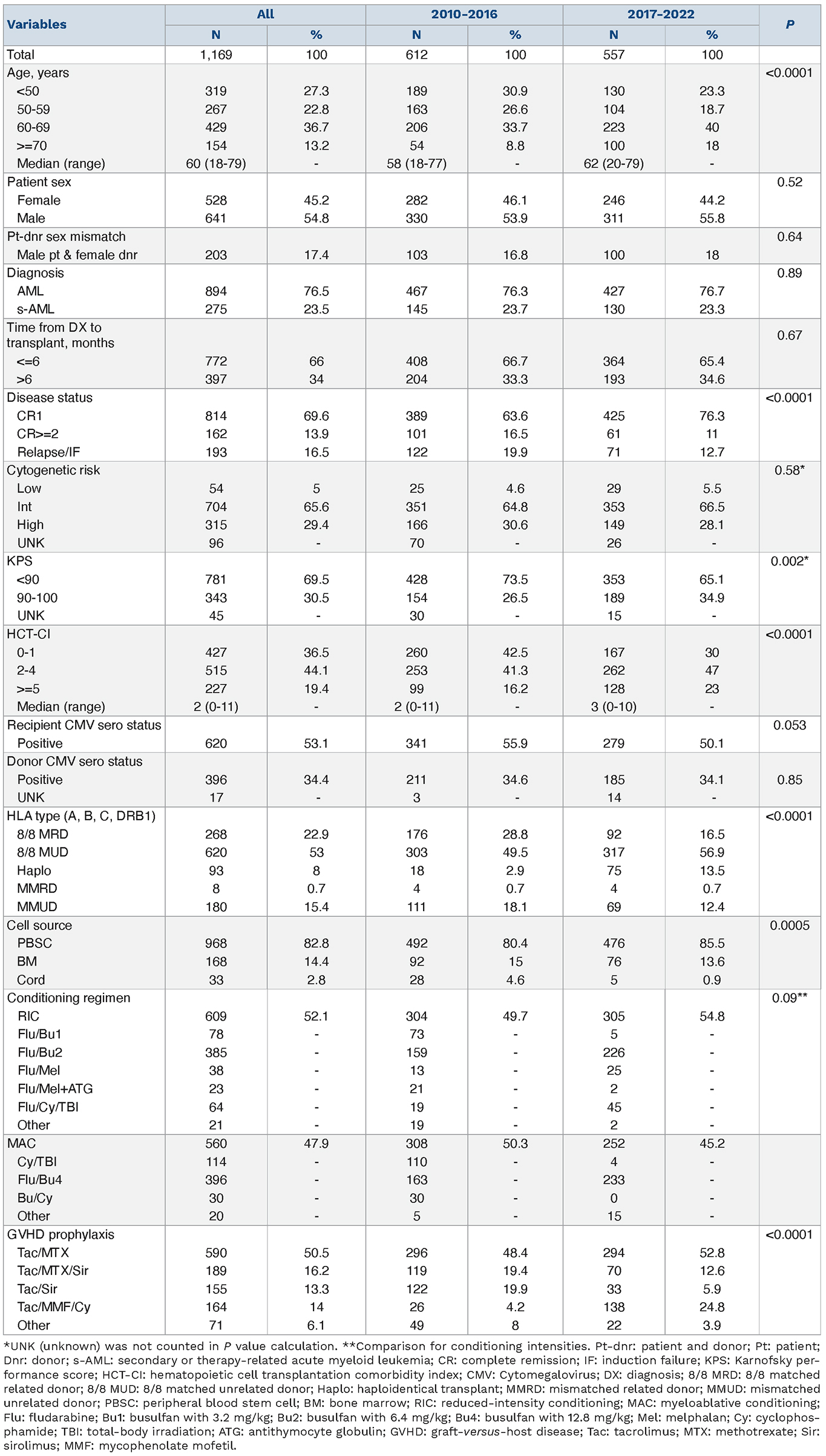 The baseline characteristics of all patients are summarized in Table 1. As shown in Table 1, baseline characteristics were well balanced between 2010-2016 and 2017-2022 with respect to sex, diagnosis, time from diagnosis to transplant and cytogenetic risk at transplant. Differences in baseline characteristics include age, disease status at transplant, HCT-comorbidity index (HCT-CI), Karnofsky performance score, donor type, cell source, conditioning regimen, and GVHD prophylaxis. These differences largely reflect changes in our practice in recent years. Notably, we transplanted more older patients (median age: 62 in 2017-2022 vs. 58 in 2010-206; age ≥70 years: 18% in 2017-2022 vs. 8.8% in 2010-2016; P<0.0001) and more patients in first complete remission (CR1) (P<0.0001) with higher comorbidity scores (HCT-CI ≥2: 70% in 2017-2022 vs. 57.5% in 2010-2016; P<0.0001) in recent years. There was also a notable increase in haploidentical and unrelated donor transplants in recent years, with concurrent reduction in umbilical cord blood transplants since 2017. There have also been shifts in GVHD prophylaxis toward more PTCY-based regimens after 2017;21 conditioning regimens with less Cy/TBI in the MAC setting, and less Flu/BU1 or ATG regimens in the RIC setting.