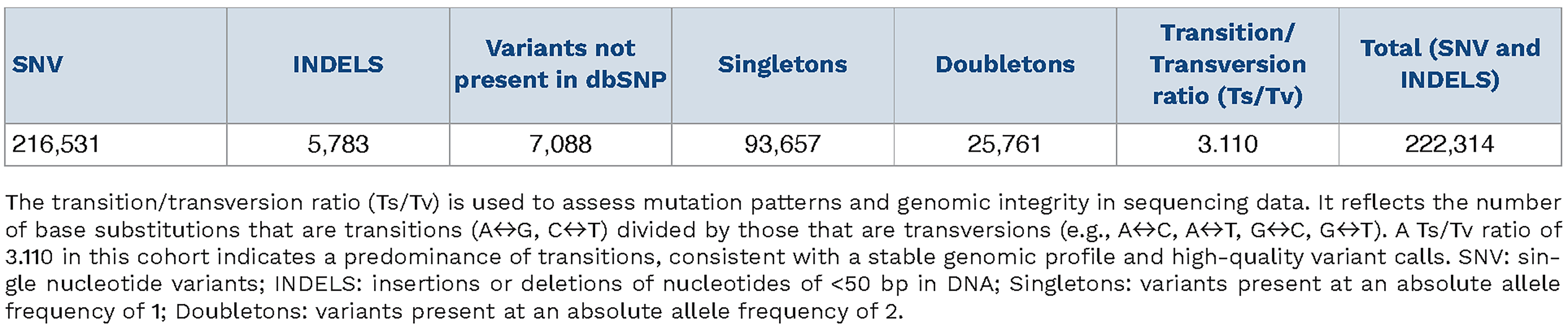 Demographic, clinical, and genetic characteristics of the BrazIT cohort are summarized in Table 1 and Figure 1. Median age at diagnosis was 0.9 years; 95% had severe hemophilia. ITI outcomes were: 64 (33%) complete success, 62 (32%) partial success, 67 (35%) failure. Exome sequencing showed high-quality data across ~34 Mb of targeted regions, with a median coverage of 123.66X and a transition/ transversion ratio (Ts/Tv ratio, i.e., a measure of sequencing data quality) of 3.11, indicative of reliable variant calls. We identified 222,314 variants, including 91,599 singletons and 7,088 novel variants, reflecting genetic diversity (Table 2). F8 haplotypes7 frequencies, defined by R503H (rs35383156), D1260E (rs1800291) and M2257V (rs1800297), were: H1 (N=133, 68.5%), H2 (N=37, 19.2%), H3 (N=10, 5.2%), H4 (N=1), H5 (N=0), and missing haplotypes (N=13, 6.7%).