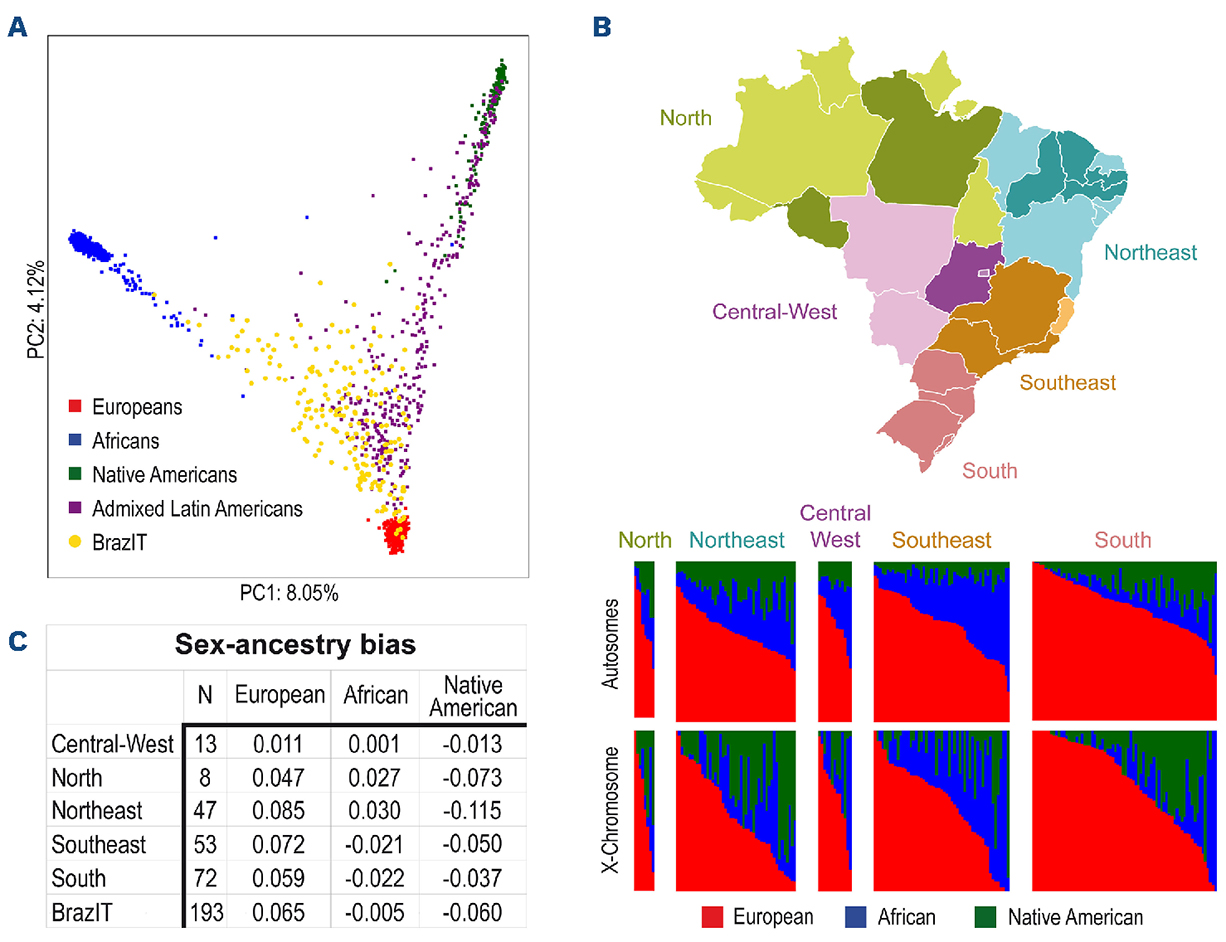 Population genetics analyses confirmed the BrazIT cohort is admixed, reflecting Brazil’s post-Columbian ancestry, predominantly European (64%), African (17%), and Native American (13%; Table 1; Figure 1). Ancestry varied between individuals, Brazilian states, and mainly between Brazilian geographic regions (nested-ANOVA for autosomes and X-chromosome, F values always >4.065, P always <0.003; Online Supplementary Table S2). European ancestry was highest in the South (73% autosomal), Native American in the Northeast (20% autosomal), and African in the Southeast (30% autosomal).