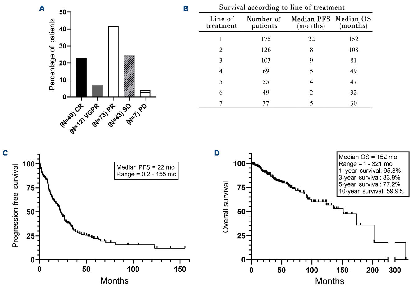 Figure 1.Survival and response rates for all patients. (A) Proportion of patients by response to front-line therapy. (B) The median progression-free survival (PFS) and overall survival (OS) for patients based on treatment number for lines 1 through to 7. (C) Kaplan-Meier analysis of PFS for all patients. (D) Kaplan-Meier analysis of OS for all patients as well as 1-, 3-, 5-, and 10-year survival rates. CR: complete response; mo: months; PD: progressive disease; PR: partial response; SD: stable disease; VGPR: very good partial response.