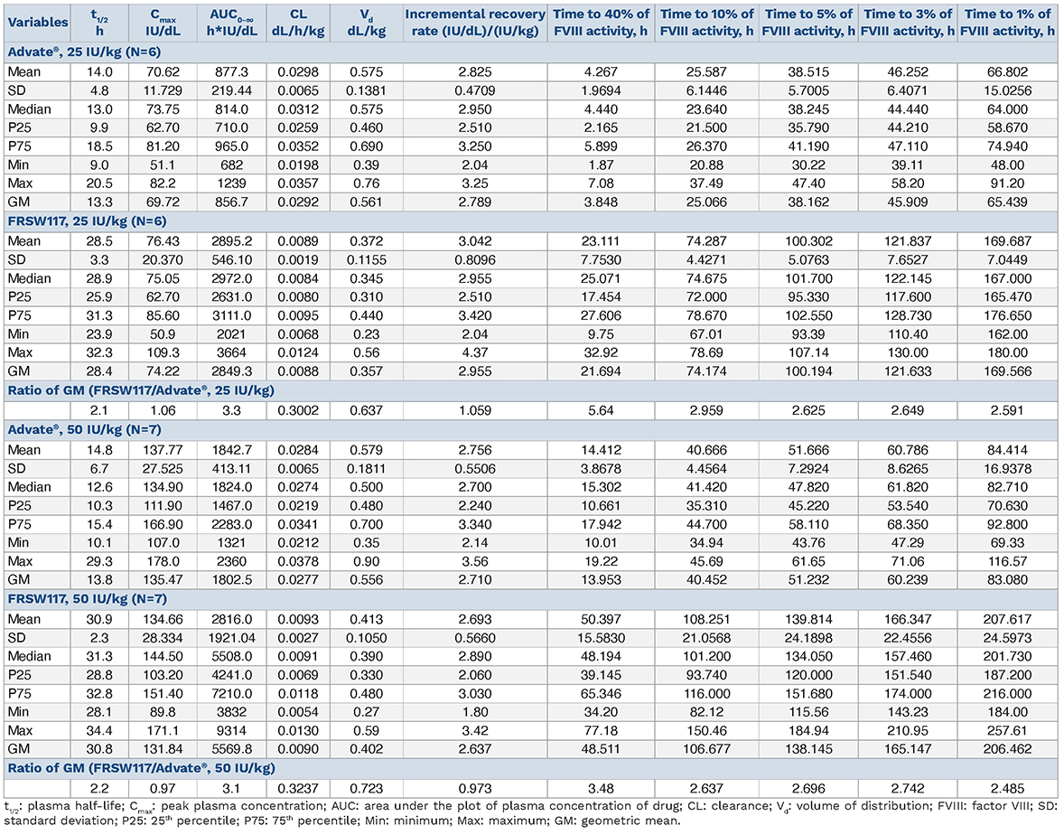 Table 2.Pharmacokinetic parameters of the single-dose phase I pharmacokinetic study and comparison between Advate® and FRSW117.