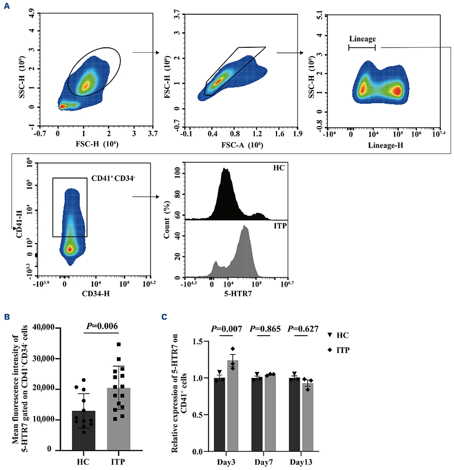 Figure 1.Expression of 5-HTR7 is elevated in megakaryocytes from patients with immune thrombocytopenic purpura. (A) Gating strategy for flow cytometry for 5-HTR7 on primary megakaryocytes ex vivo. (B) Quantification of 5-HTR7 expression on megakaryocytes. The mean fluorescence intensity of 5-HTR7 of the CD41+CD34- cell population was calculated and compared between healthy controls (HC) and patients with immune thrombocytopenic purpura (ITP). (C) Expression of 5-HTR7 on the cultured CD41+ cell population. The CD34+ megakaryocytc cells were cultured with bone marrow supernatant from HC or ITP patients. Expression of 5-HTR7 on cells on day 3, day 7, and day 10 was measured by flow cytometry. Representative results of three independent experiments are shown. Data are presented as the mean ± standard error of mean.