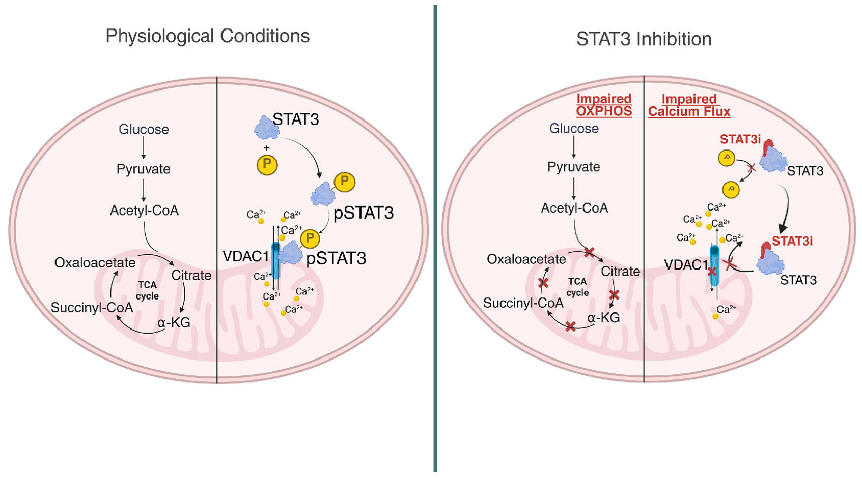Figure 6.Model of the roles of STAT3 and VDAC1 in acute myeloid leukemia cells. STAT3 is phosphorylated at the S727 site and it localizes to the mitochondria, where it interacts with VDAC1 to regulate calcium intake into the mitochondria. Following STAT3 inhibition, this interaction is disrupted, leading to less mitochondrial calcium and mitochondrial dysfunction. Cartoon created in BioRender. Fainstad B. (2025) https://BioRender.com/e15r984. CoA: co-enzyme A; TCA: tricarboxylic; a-KG: alpha ketoglutarate; VDAC1: voltage-dependent anion channel 1; STAT3: signal transducer and activator of transcription 3; OXPHOS: oxidative phosphorylation; STAT3i: STAT3 inhibitor.