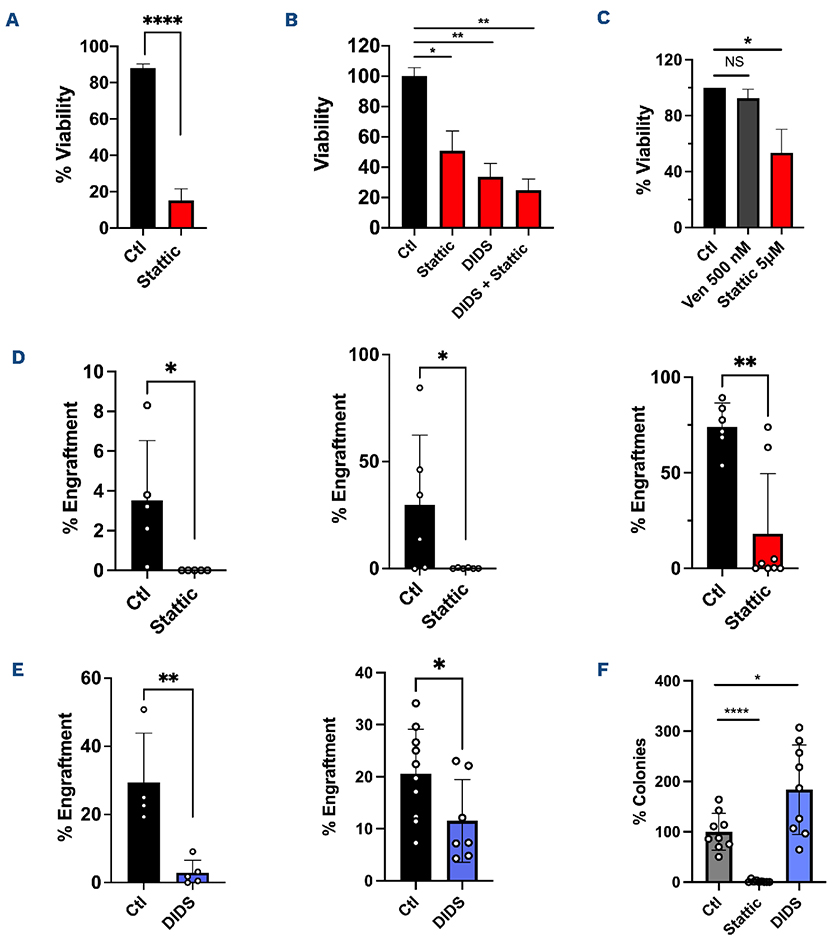 Figure 5.STAT3 and VDAC1 inhibition decreases viability of acute myeloid leukemia cells and impairs leukemia stem cell function. (A) Viability as measured by flow cytometry of MOLM-13 cells treated with Stattic 5 [xM or vehicle control for 24 hours. (B) Viability as measured by flow cytometry of MOLM-13 cells treated with Stattic 5 [xM, DIDS 400 [xM, their combination or vehicle control for 24 hours. (C) Viability as measured by flow cytometry of reactive oxygen species-low enriched leukemia stem cells isolated from acute myeloid leukemia (AML) patients’ samples and treated with venetoclax 500 nM, Stattic 5 [xM or vehicle control for 24 hours. (D) Engraftment as measured by human CD45 positivity in NSG-S mice injected with bone marrow cells from three primary AML samples treated ex vivo with Stattic 5 [xM or vehicle control for 16 hours. (E) Engraftment as measured by human CD45 positivity in NSG-S mice injected with bone marrow cells from two primary AML samples treated ex vivo with DIDS 400 [xM or vehicle control for 16 hours. (F) Colony-forming assay of CD34+ cells isolated from normal bone marrow samples and treated with Stattic 5 [xM, DIDS 400 [xM or vehicle control for 16 hours then plated on methylcellulose. Statistical analyses were performed using a Student t test. *P≤0.05, **P≤0.01, ***P≤0.001, ****P≤0.0001. NS: not statistically significant; Ctl: vehicle control.