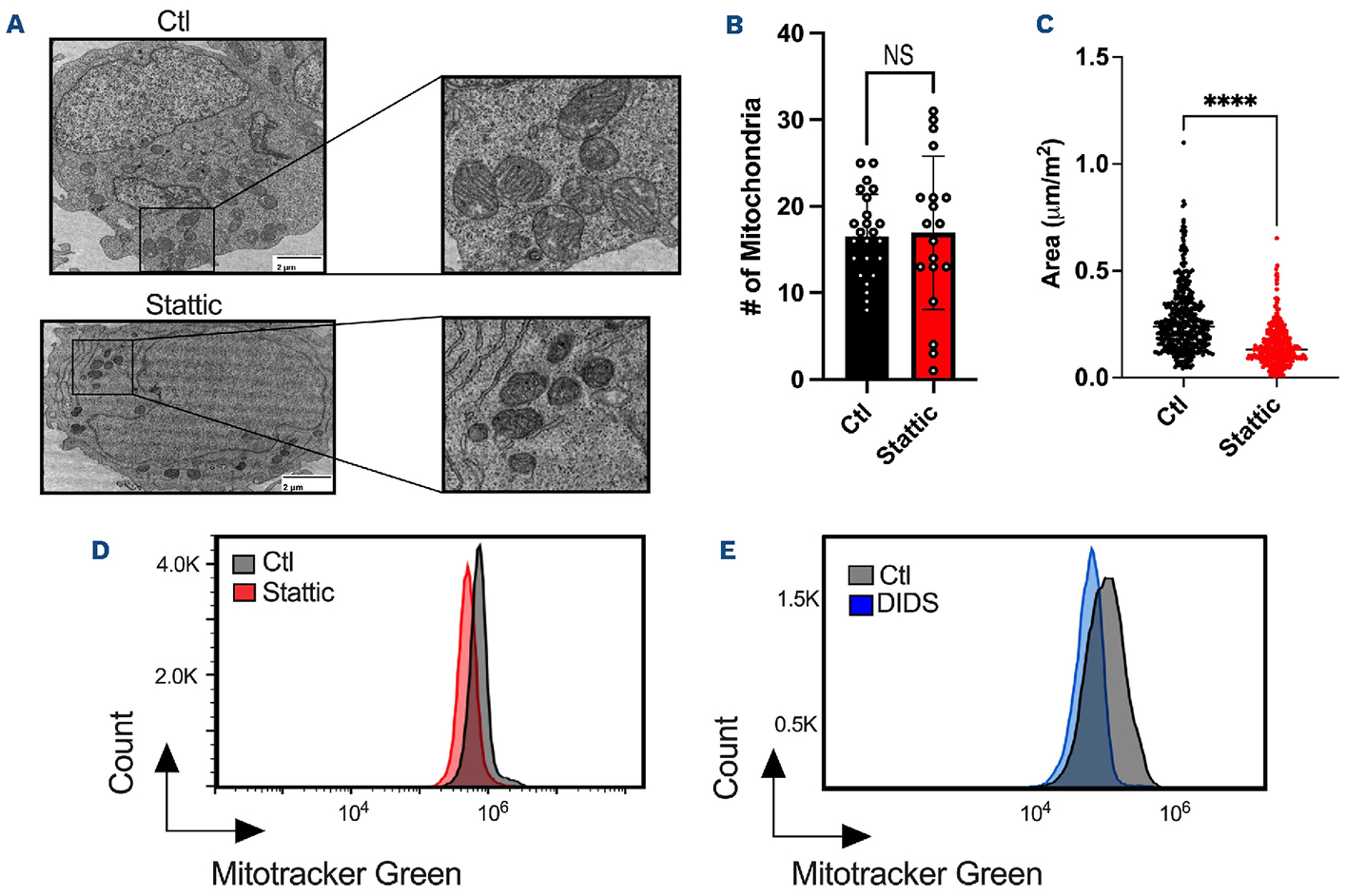 Figure 4.STAT3 and VDAC1 inhibition leads to decreased mitochondrial mass. (A) Representative electron microscopy images of MOLM-13 cells treated with Stattic 5 μM for 14 hours or vehicle control. (B) Quantification of number of mitochondria imaged by electron microscopy in MOLM-13 cells treated with Stattic 5 μM for 14 hours or vehicle control. (C) Quantification of mitochondrial area in MOLM-13 cells treated with Stattic 5 μM for 14 hours or vehicle control. (D) Mitochondrial mass as measured by flow cytometry with Mitotracker green stain in MOLM-13 whole cells in the presence of Stattic 5 μM for 14 hours compared to vehicle control. (E) Mitochondrial mass as measured by flow cytometry with Mitotracker green stain in MOLM-13 whole cells in the presence of DIDS 400 μM for 14 hours. Statistical analyses were performed using a Student t test. ****P≤0.0001. NS: not statistically significant; Ctl: vehicle control.