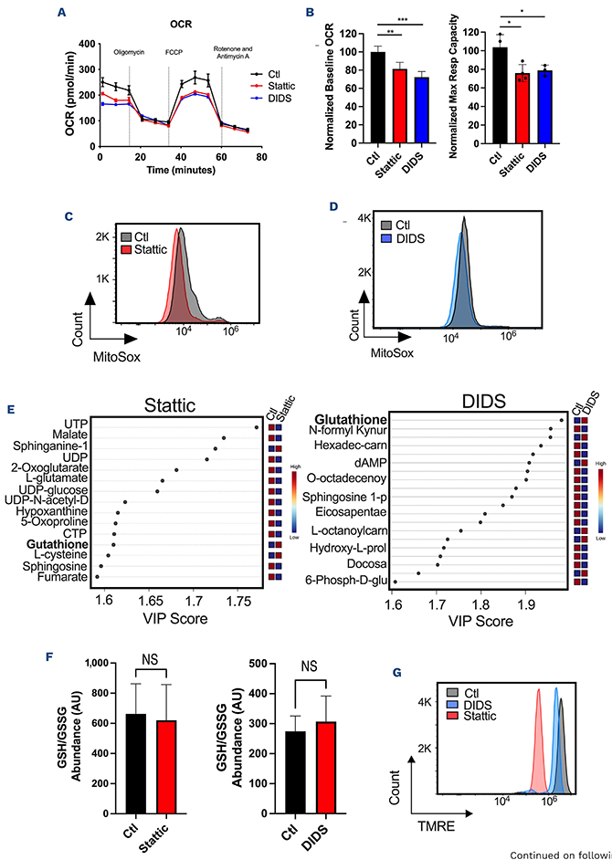 Figure 3.STAT3 and VDAC1 inhibition results in decreased OXPHOS and reduction in mitochondrial membrane potential. (A) Seahorse Mito Stress Test in MOLM-13 cells in the presence or absence of Stattic 5 [xM, DIDS 400 [xM or dimethylsulf oxide control after 9 hours in culture. (B) Quantification of the Seahorse Mito Sress Test at baseline oxygen consumption rates and maximal respiratory capacity; three independent experiments. (C) Mitochondrial reactive oxygen species as measured by flow cytometry (MitoSox) in MOLM-13 whole cells treated with Stattic 5 [xM or vehicle control for 9 hours. (D) Mitochondrial reactive oxygen species as measured by flow cytometry (MitoSox) in MOLM-13 whole cells treated with DIDS 400 [xM or vehicle control for 9 hours. (E) Variable importance in projection (VIP) plots showing the top metabolites changed in global metabolomics of MOLM-13 cells treated with Stattic or DIDS compared to vehicle controls for 9 hours. VIP scores are a measure calculated to determine how much each metabolite contributes to the separation between different groups in a model. (F) Glutathione to glutathione disulfide ratio in MOLM-13 cells treated with Stattic 5 [xM or DIDS 400 [xM for 9 hours compared to vehicle control based on mass-spectrometry global metabolomics. (G) Mitochondrial membrane potential as measured by TMRE staining of MOLM-13 whole cells treated with Stattic 5 [xM or DIDS 400 [xM for 9 hours compared to vehicle control. Statistical analyses were performed using a Student t test. *P≤0.05, **P≤0.01, ***P≤0.001. OCR: oxygen consumption rate; Ctl: control; GSH: glutathione; GSSG: glutathione disulfide; AU: arbitrary units.