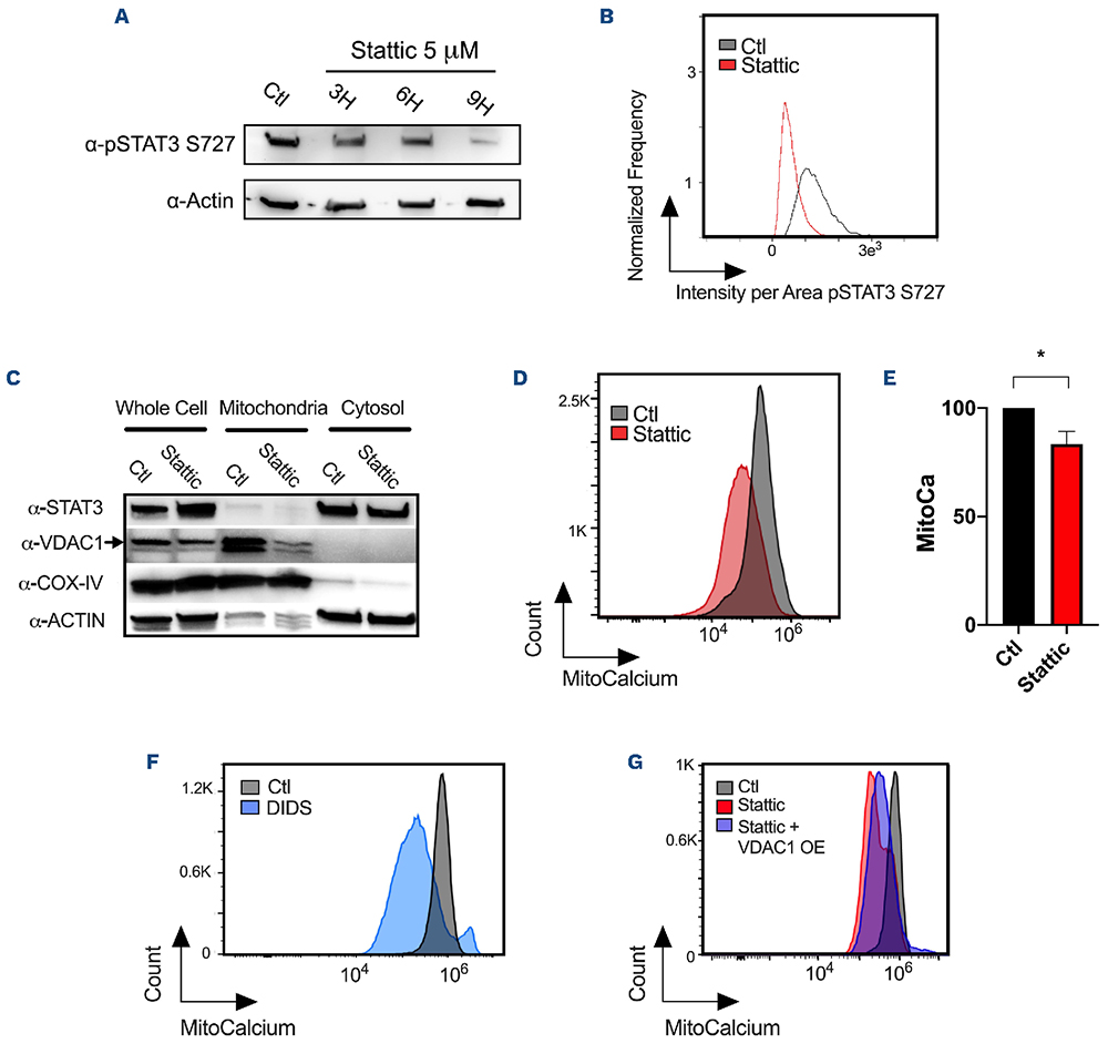 Figure 2.STAT3 inhibition results in decreased mitochondrial VDAC1. (A) Western blot showing pSTAT3 S727 in MOLM-13 cells in the presence of Stattic 5 [xM at 3, 6 or 9 hours compared to pSTAT3 S727 in control cells treated with vehicle (Ctrl). (B) Intensity per area of pSTAT3 S727 in the mitochondria of MOLM-13 cells treated with Stattic or vehicle control as measured by ImageStream flow cytometry. (C) Western blot showing protein expression of STAT3 and VDAC1 in whole-cell, mitochondrial or cytosolic fractions of MOLM-13 cells treated with Stattic 5 [xM or vehicle control for 9 hours. COX-IV and actin antibodies served as mitochondrial and cytosolic controls, respectively. (D) Mitochondrial calcium as measured by flow cytometry (Rhod2AM) in MOLM-13 whole cells treated with Stattic 5 [xM or vehicle control for 9 hours. (E) Quantification of three technical replicates of mitochondrial calcium in MOLM-13 cells treated with Stattic 5 [xM or vehicle control for 9 hours. (F) Mitochondrial calcium as measured by flow cytometry (Rhod2AM) in MOLM-13 whole cells treated with DIDS 400 [xM or vehicle control for 9 hours (G) Mitochondrial calcium as measured by flow cytometry (Rhod2AM) in sham-electroporated versus VDAC1-overexpressing plasmid electroporated MOLM-13 whole cells treated with Stattic 5 [xM or vehicle control for 9 hours. Statistical analyses were performed using a Student t test. *P≤ 0.05.