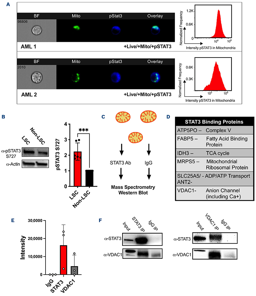 Figure 1.STAT3 localizes to the mitochondria and it interacts with mitochondrial proteins. (A) Representative ImageStream of two acute myeloid leukemia (AML) patients’ samples stained for mitochondria (Tomm20), pSTAT3 S727, and their respective overlays. In AML 1, 87.5% of cells were positive for pSTAT3 S727 in the mitochondria out of 50,205 events. In AML 2, 81.7% of the cells were positive for pSTAT3 S727 in the mitochondria out of 41,615 events. (B) Western blot and quantification of pSTAT3 at S727 comparing leukemia stem cells to bulk AML cells of four primary AML samples. (C) Cartoon representation of the experimental design for immunoprecipitation experiments. Mitochondria were extracted from MOLM-13 cells, followed by immunoprecipitation assays with STAT3 antibody or IgG control. (D) Table outlining proteins interacting with STAT3 in the mitochondria of MOLM-13 cells based on mass spectrometry. (E) Intensity-based absolute quantification of VDAC1 protein bound to STAT3 from mitochondrial extracts. IgG served as a negative control and STAT3 as a positive control. (F) Western blots from STAT3 pull-down (left) showing STAT3 and VDAC1 protein expression, and VDAC1 pull-down (right) showing STAT3 and VDAC1 protein expression. Statistical analyses were performed using a Student t test. ***P≤0.001. LSC: leukemic stem cells; Ab: antibody; IP: immunoprecipitation.