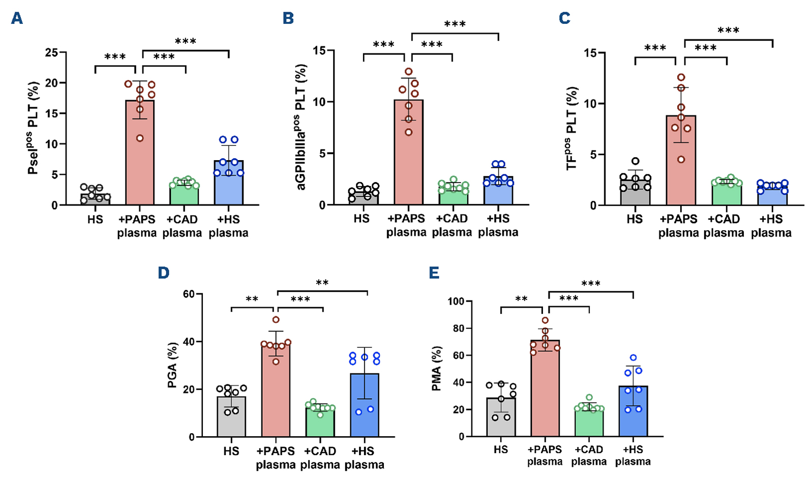 Figure 5.In vitro effect of primary anti-phospholipid syndrome plasmas on adhesive/prothrombotic platelet phenotype and heteroaggregate formation. The figure shows the percentages of platelets expressing P-selectin (Psel; A), activated GPIIbIIIa (aGPIIbIIIa; B) and tissue factor (TF; C) upon whole blood incubation with pooled primary anti-phospholipid syndrome plasma (PAPS; red bars), plasma from chronic coronary artery diseas (CAD) patients (green bars) or autologous healthy subjects’ plasmas (HS; blue bars). Panels (D, E) show the percentages of platelet-granulocyte (PGA) and platelet-monocyte (PMA) aggregates upon incubation with PAPS, CAD or autologous HS plasmas, respectively. The expression of platelet activation markers in whole blood of HS was reported as reference (grey bars). Data are reported as individual values (N=7) and mean ± standard deviation of antigen-positive cells. **P<0.01; ***P<0.001.