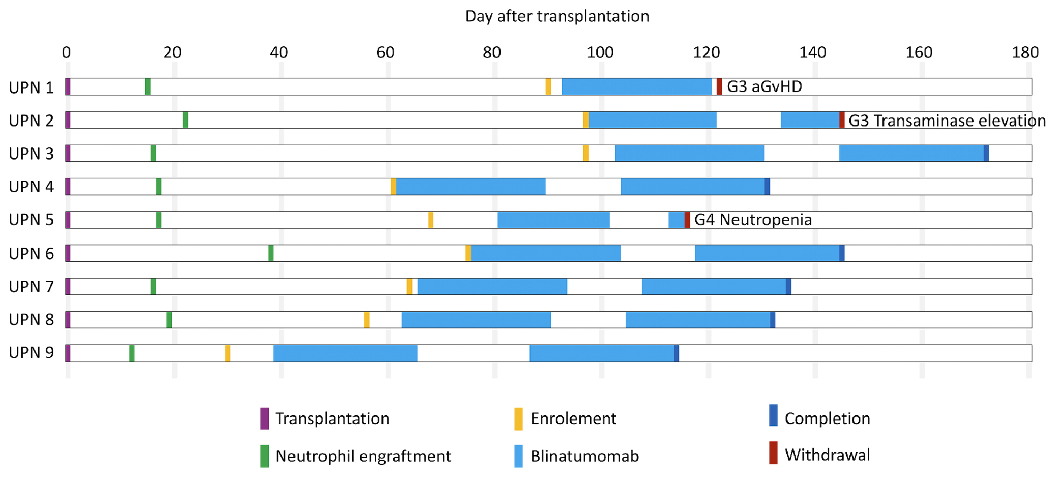 Figure 1.Swimmer plots for clinical courses. Swimmer plots illustrating the clinical courses of enrolled patients who received maintenance therapy with blinatumomab following allogeneic hematopoietic cell transplant for relapsed/refractory B-cell acute lymphoblastic leukemia. The horizontal axis represents days after transplantation, with the purple mark on the starting line indicating the transplantation date and the green mark denoting the neutrophil engraftment date. Blue indicates study enrollment, light blue denotes blinatumomab treatment duration, navy represents study treatment completion, and red demonstrates withdrawal. G3: grade 3; G4: grade 4; UPN: unique patient number. aGVHD: acute graft-versus-host disease.